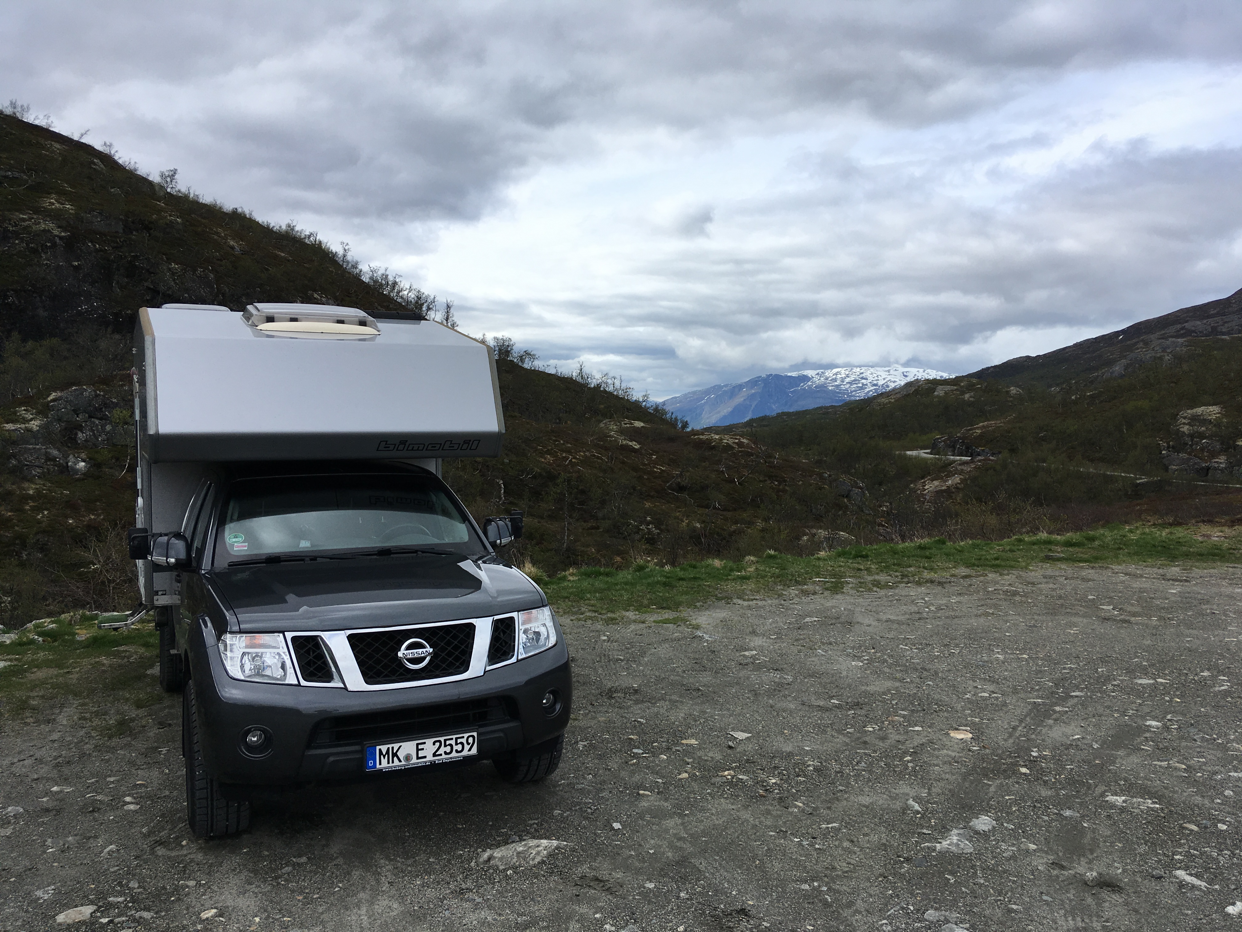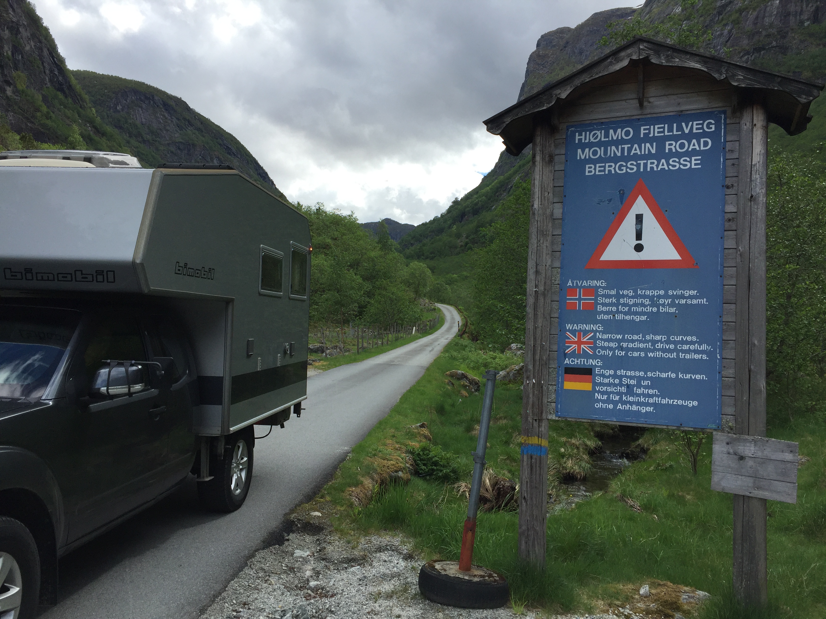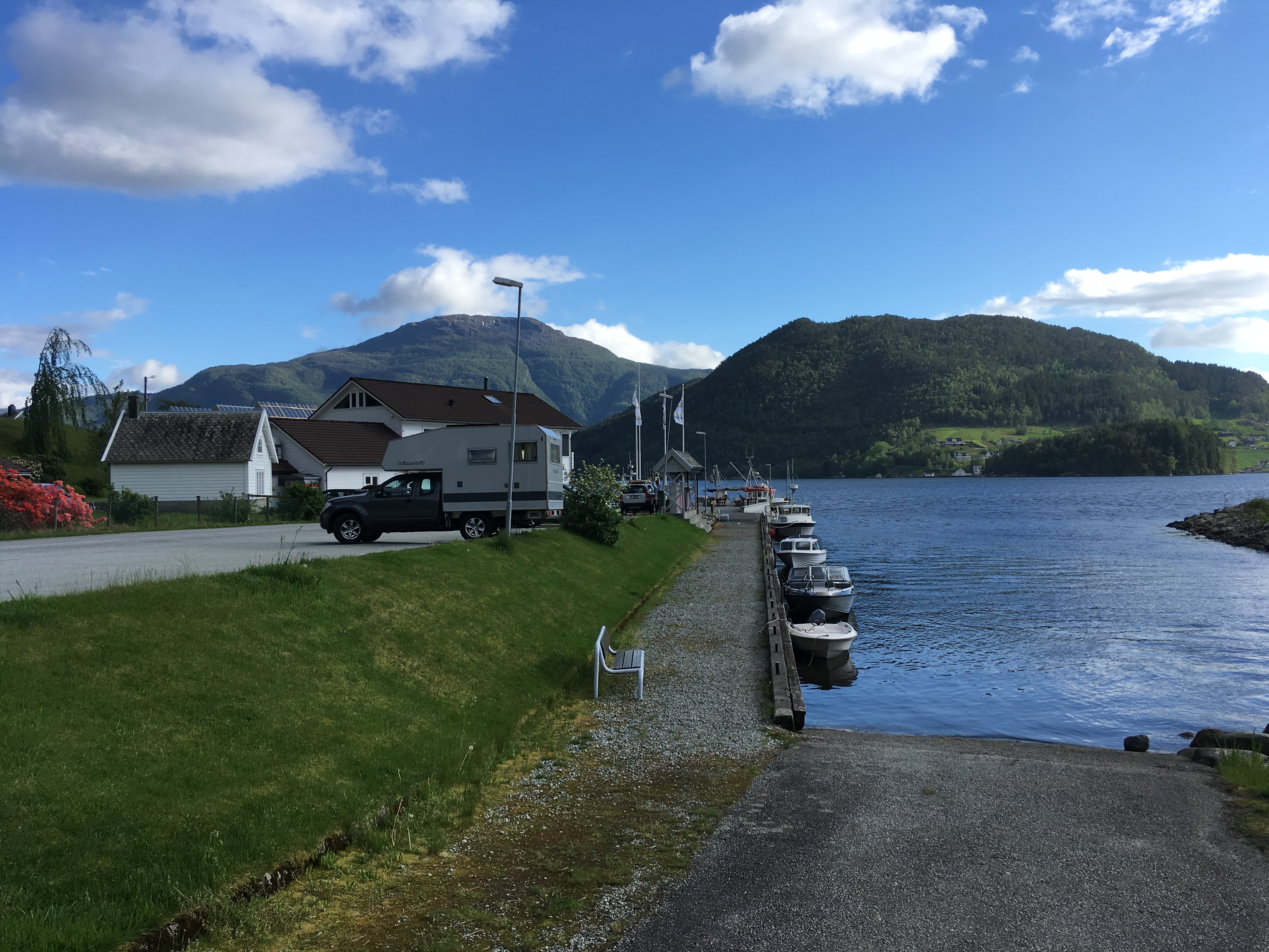 Nun „klettert“ Bimo wieder bergan und durchquert eine tolle Gebirgslandschaft mit Schneefeldern und vereisten Seen. Auf unserm Plan steht nun die Stabkirche von Rodal. Sie ist leider geschlossen und kann nicht besichtigt werden, schade. Also weiter zum Hardangerfjord, vorbei an Obstbaumplantagen – leider sind wir für die Obstbaumblüte zu spät – auf den Wanderparkplatz in Kinsarvik zum übernachten. Ein rauschender Bergbach schläfert uns ein.