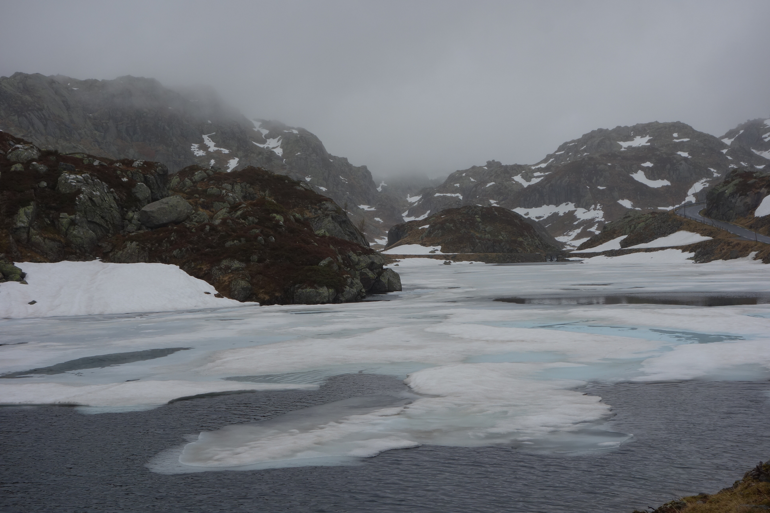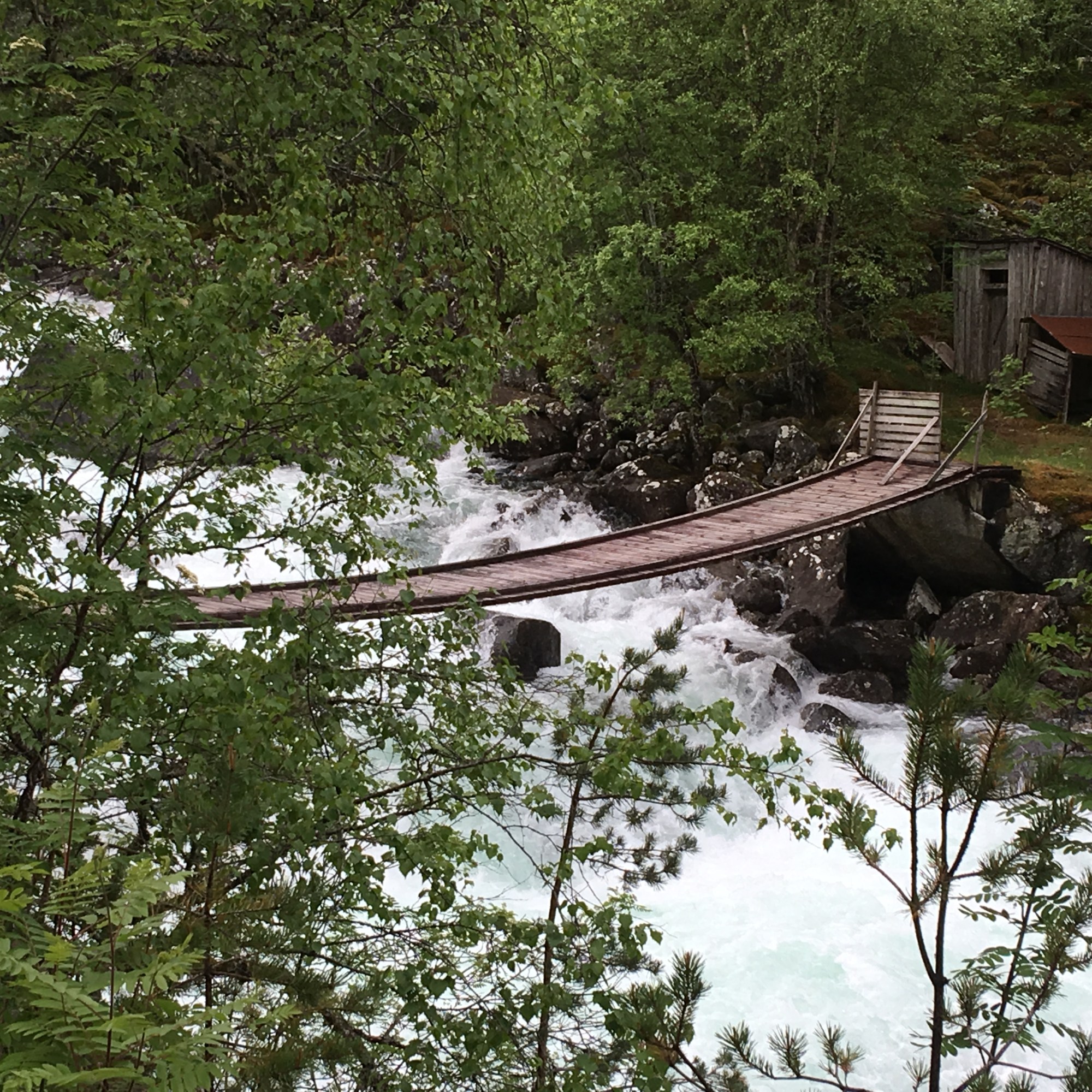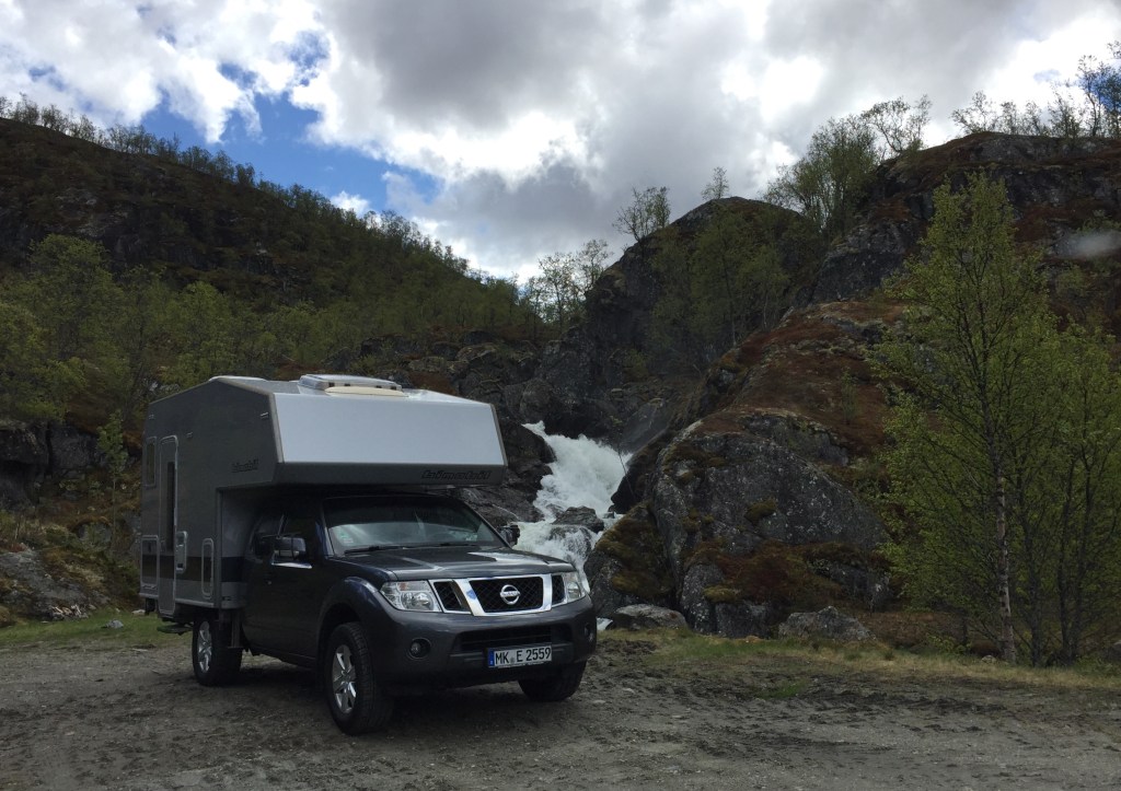 Nun „klettert“ Bimo wieder bergan und durchquert eine tolle Gebirgslandschaft mit Schneefeldern und vereisten Seen. Auf unserm Plan steht nun die Stabkirche von Rodal. Sie ist leider geschlossen und kann nicht besichtigt werden, schade. Also weiter zum Hardangerfjord, vorbei an Obstbaumplantagen – leider sind wir für die Obstbaumblüte zu spät – auf den Wanderparkplatz in Kinsarvik zum übernachten. Ein rauschender Bergbach schläfert uns ein.