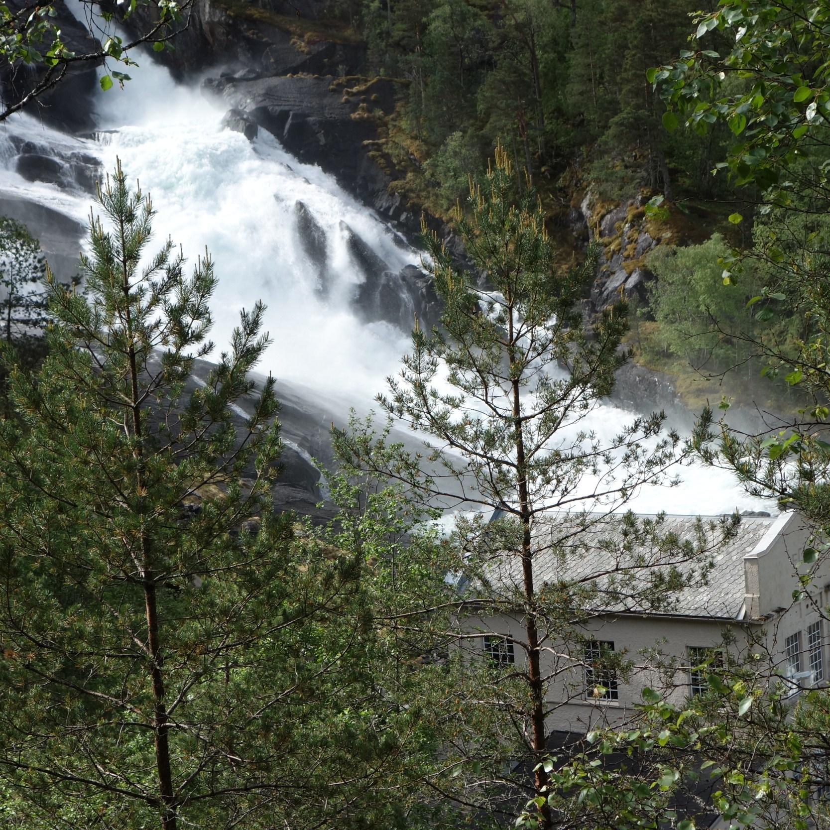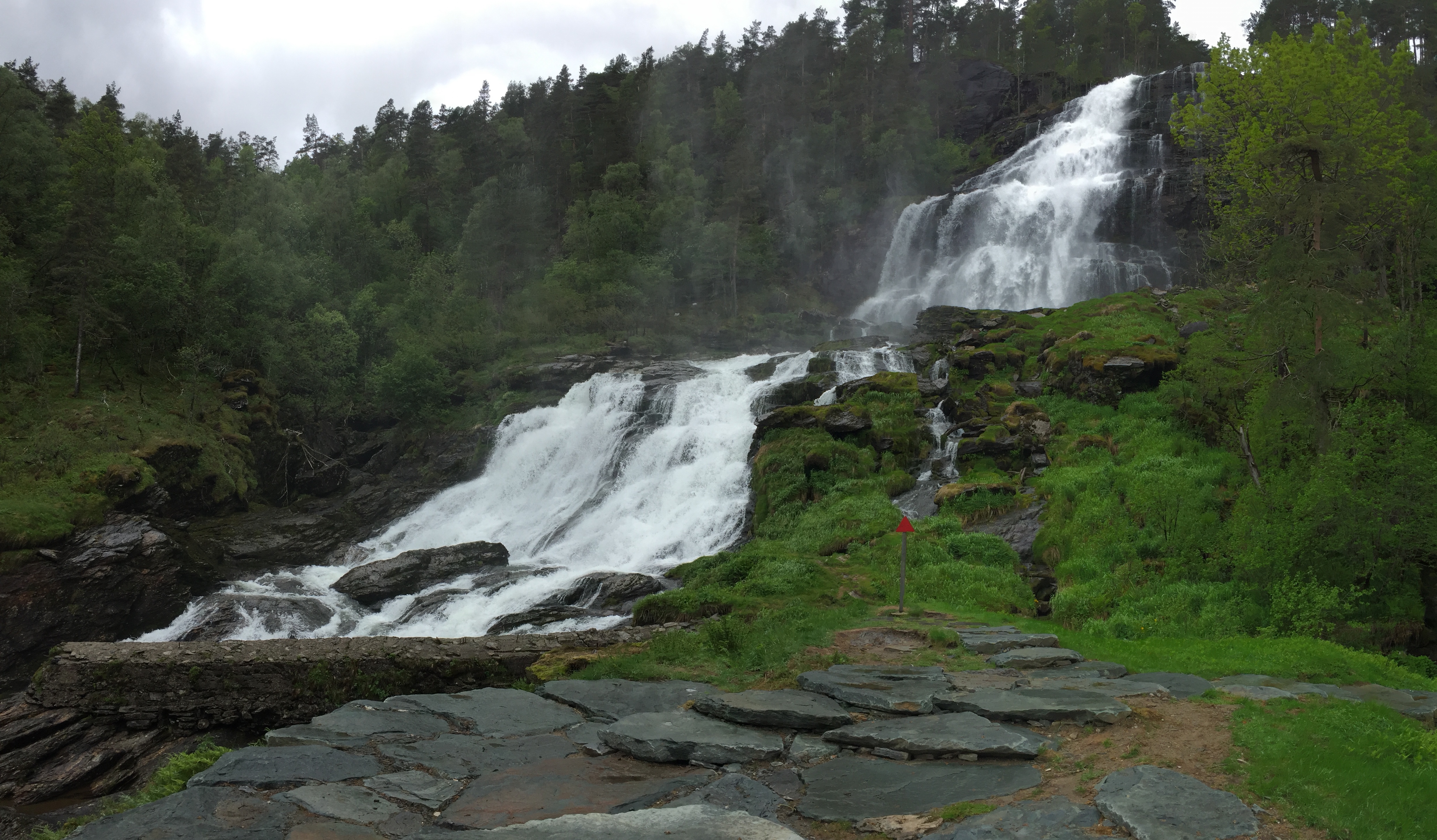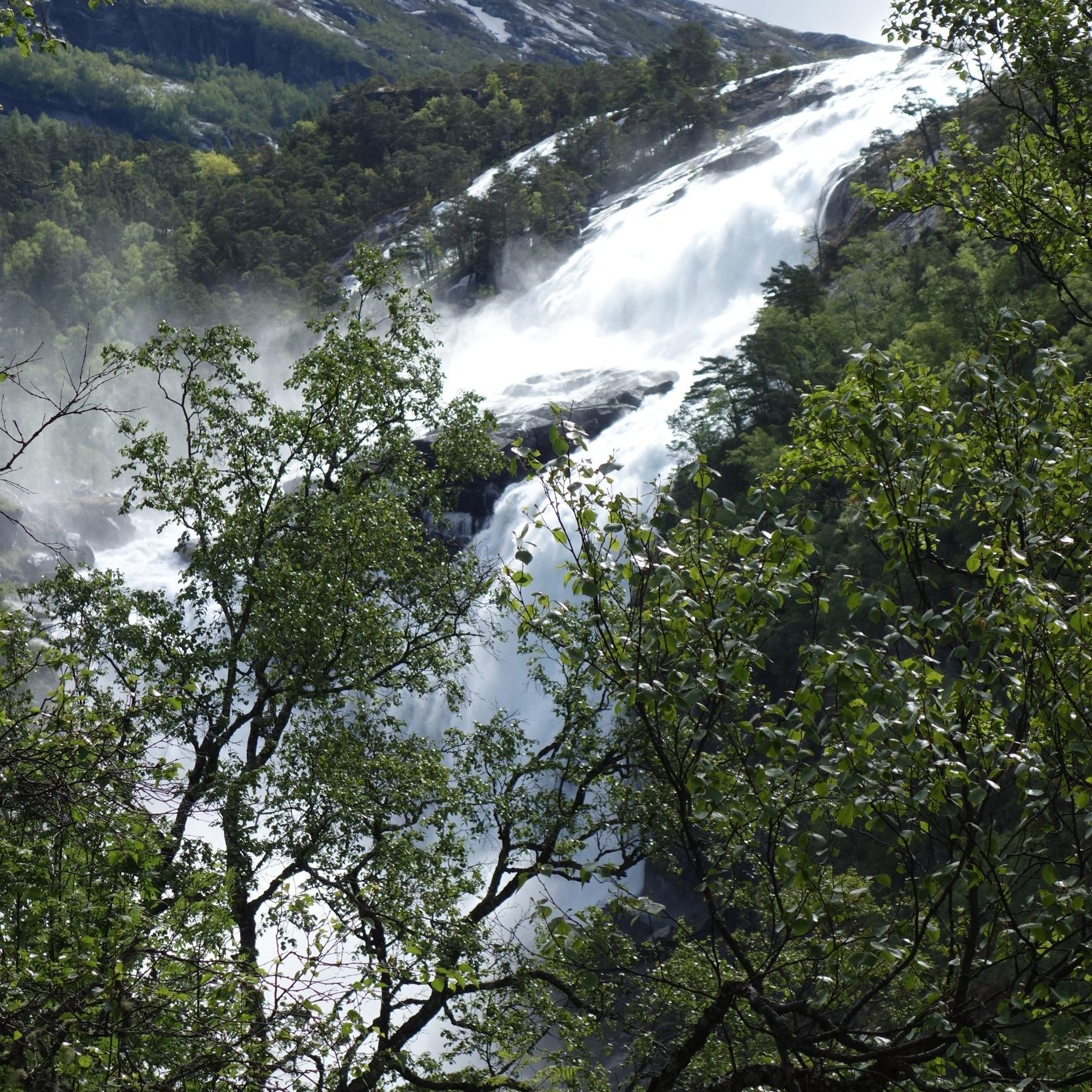 Gut ausgeschlafen und ohne Muskelkater geht es in Richtung Hardangerfjord. Die Landschaft wechselt unendlich schnell und nach einem der vielen Tunnels ist auf der linken Seite der Svandalsfossen. Es gibt einen kleinen Parkplatz mit schönem Blick auf den Saudafjord und eine gut ausgebaute Spazierstrecke den Wasserfall hinauf. Weiter geht es am Fjord entlang nach Sauda.