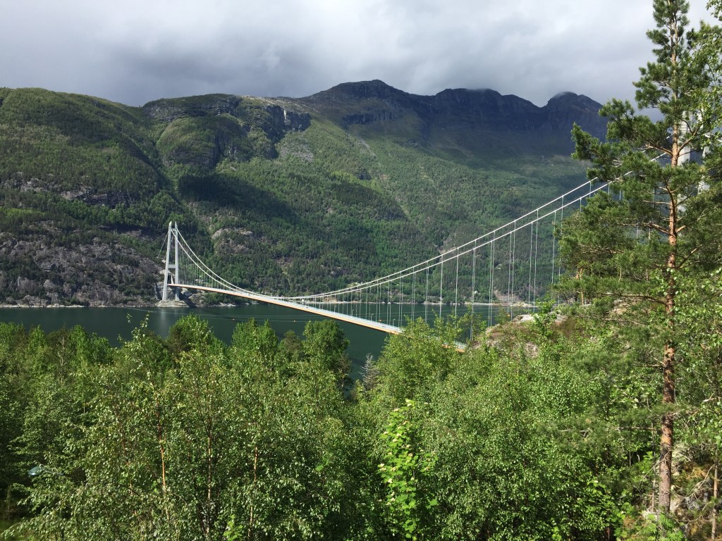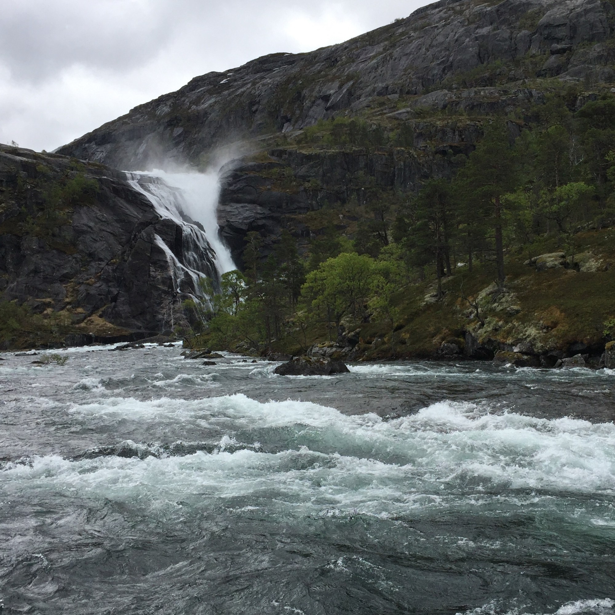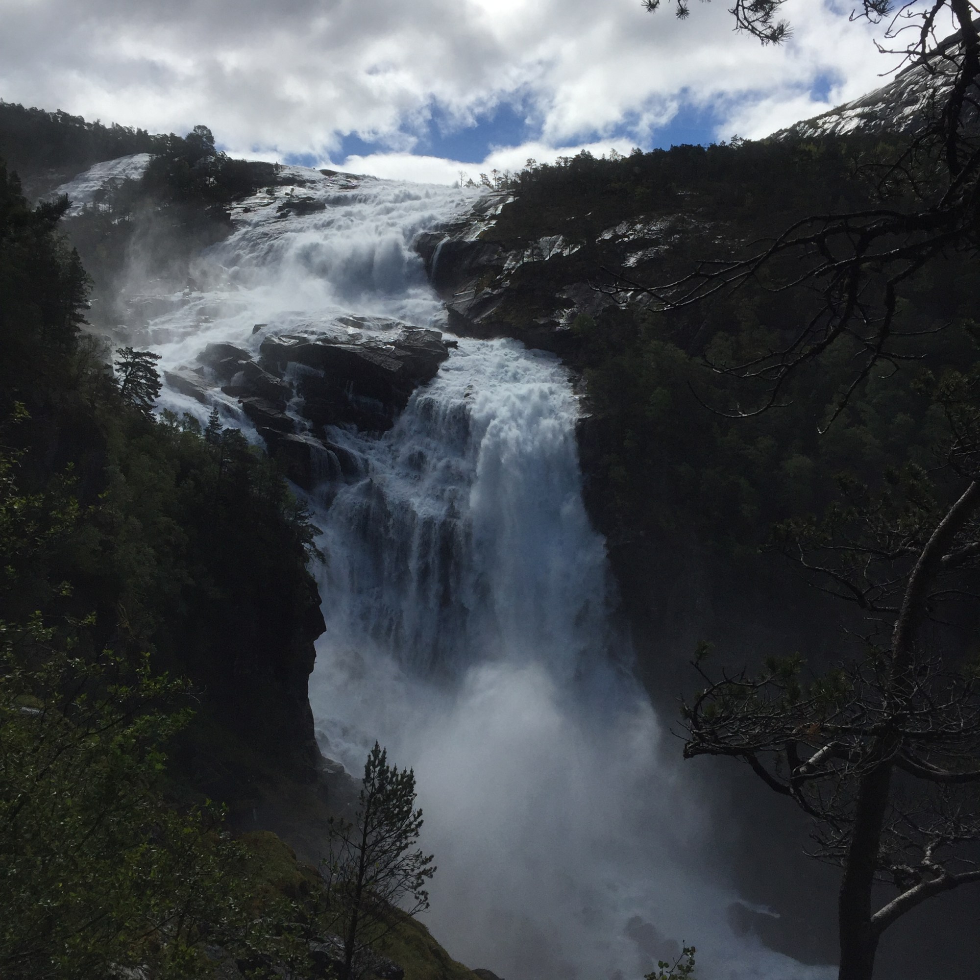 Gut ausgeschlafen und ohne Muskelkater geht es in Richtung Hardangerfjord. Die Landschaft wechselt unendlich schnell und nach einem der vielen Tunnels ist auf der linken Seite der Svandalsfossen. Es gibt einen kleinen Parkplatz mit schönem Blick auf den Saudafjord und eine gut ausgebaute Spazierstrecke den Wasserfall hinauf. Weiter geht es am Fjord entlang nach Sauda.