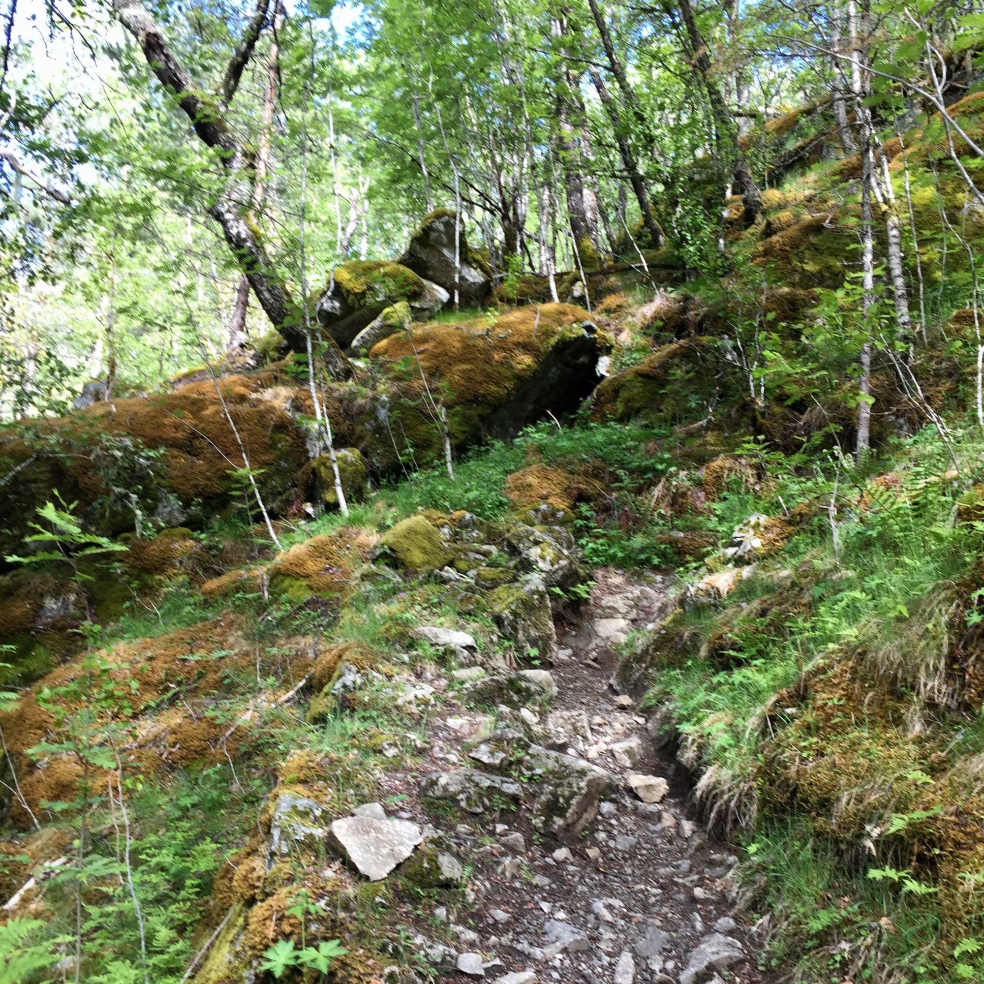 Bei „durchwachsenem“ Wetter starten wir unsere Wanderung zu den „vier Wasserfällen“. Die erst Etappe – vorbei am Kraftwerk – bis zum 1. Wasserfall des Kinso legen wir auf dem Schotterweg zurück. An der Gabelung vor den ersten Serpentinen entscheiden wir uns für den Wanderpfad – rechte Abzweigung -. Für uns die richtige Wahl! Der Weg ist deutlich anspruchsvoller, aber dafür sehr interessant. Er läuft immer nah am Fluss entlang, der laut tosend ins Tal rauscht.