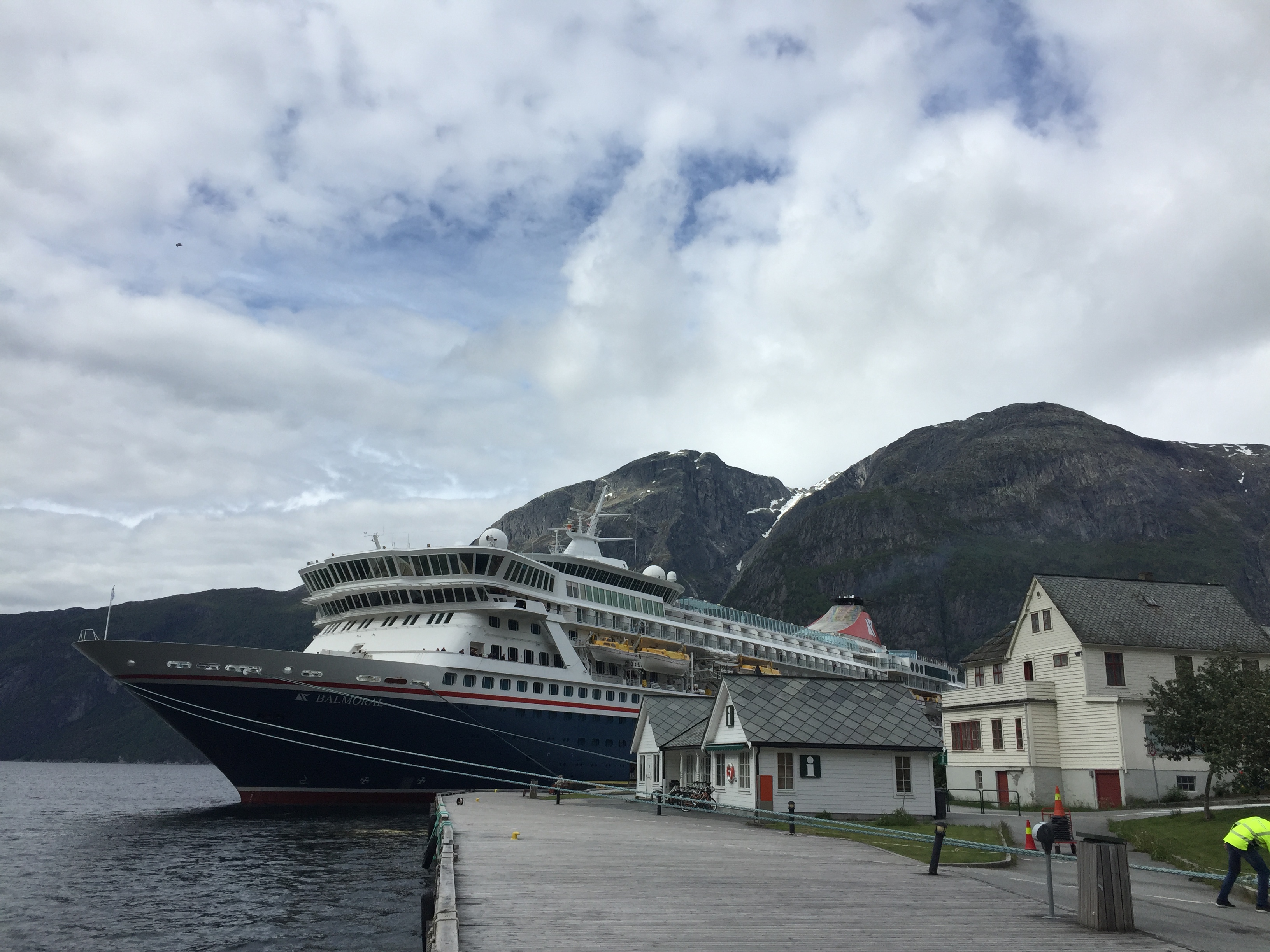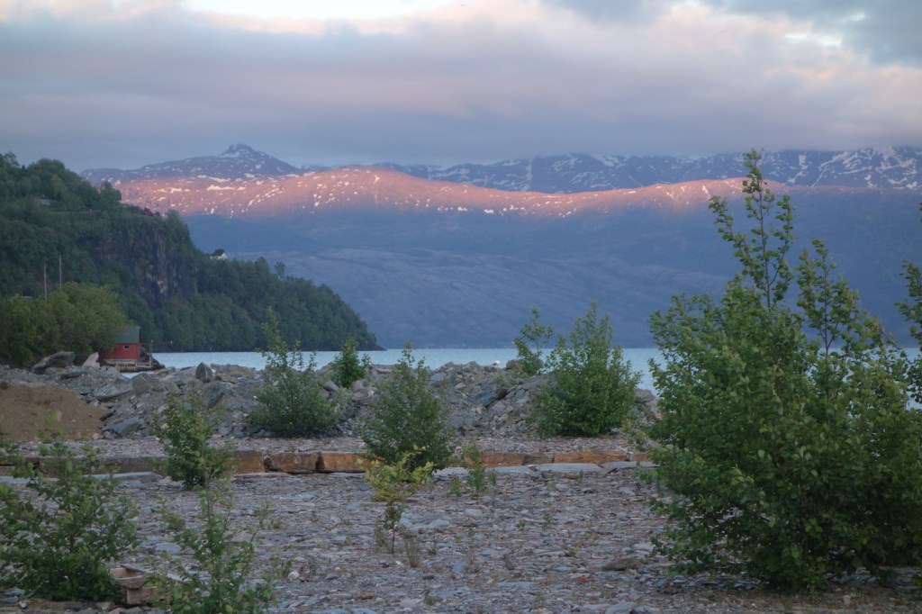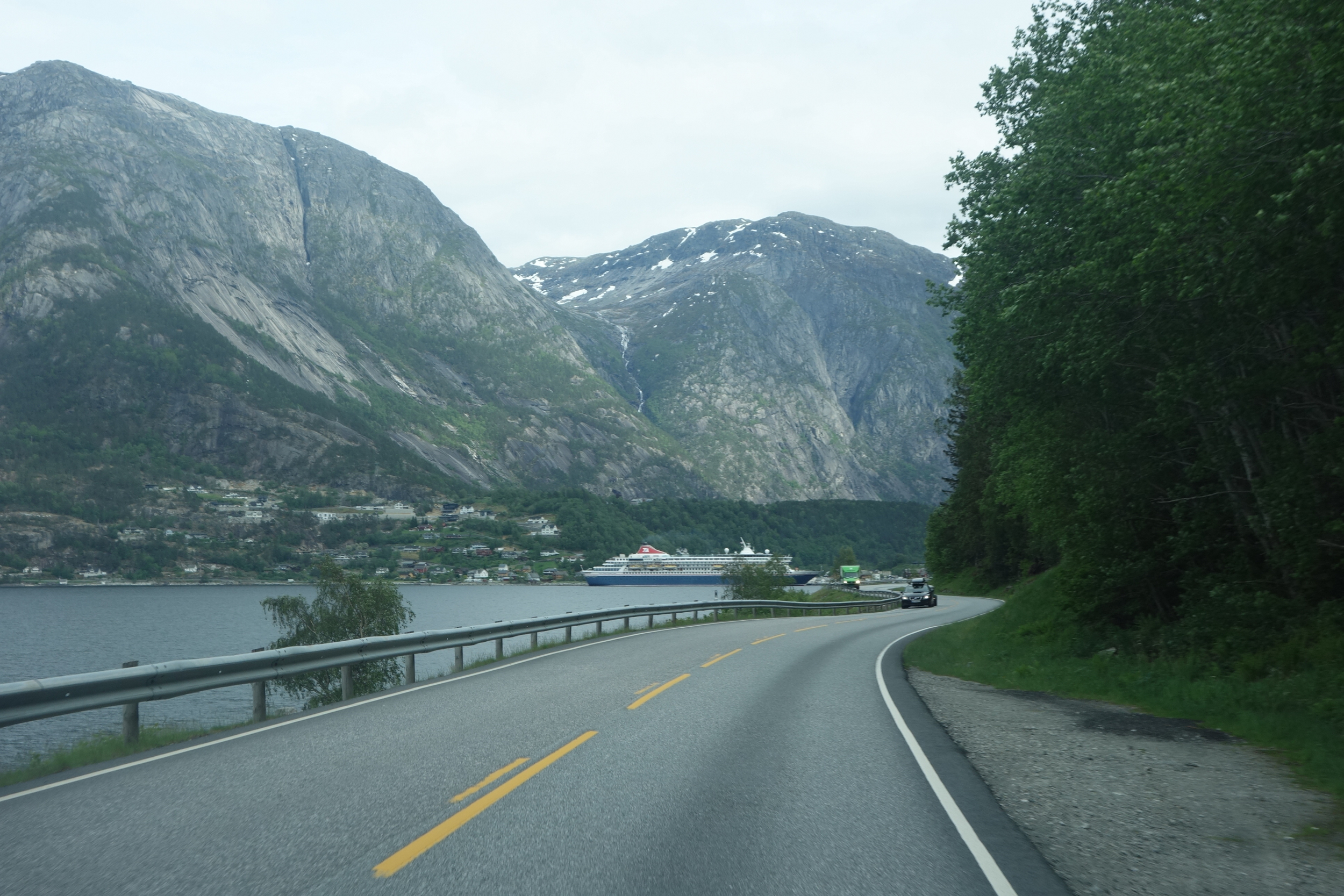In Eidfjord legt, während unserem Aufenthalt, ein Hurtigruten-Schiff an und auch wieder ab. Weiter geht es über die 7 bis Dyranut und von dort aus über eine steile, einspurige Schotterstraße zum Wanderparkplatz Hardangervidda auf 830 Höhenmetern. Ein wunderschöner Sonnenuntergang entschädigt für die „raue“ Wegstrecke.