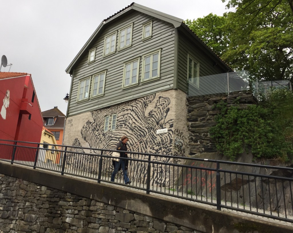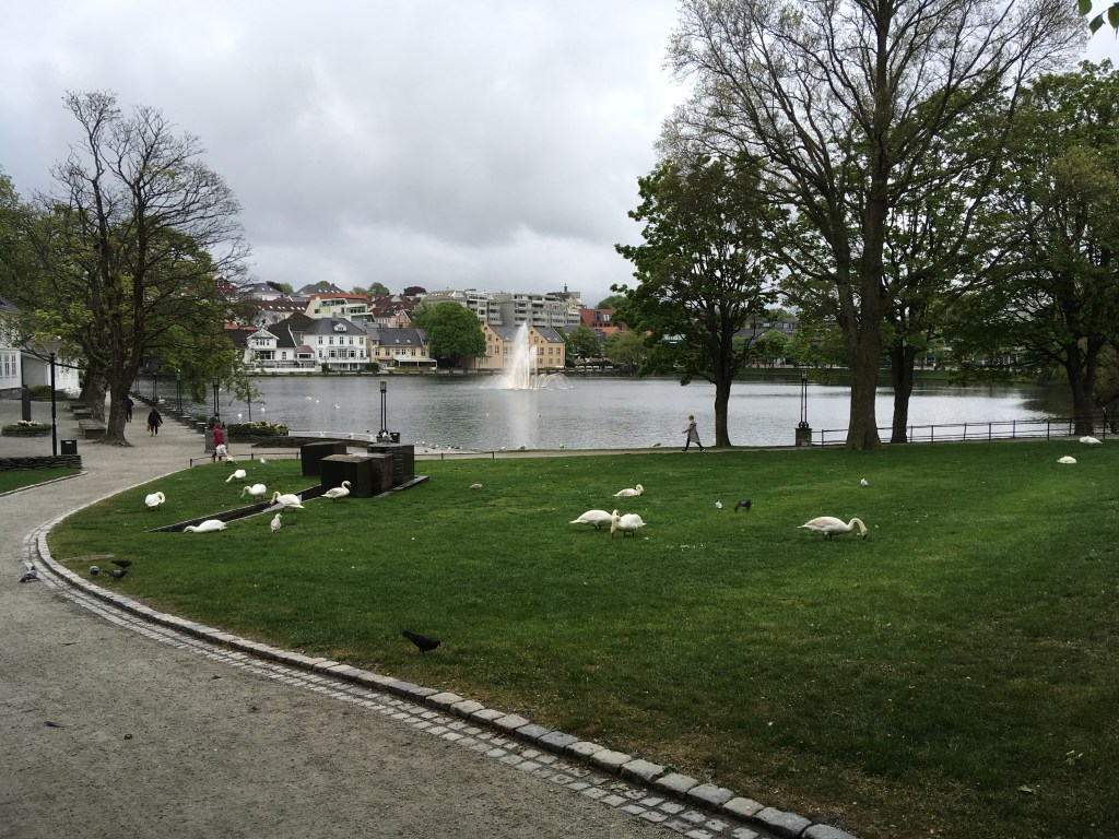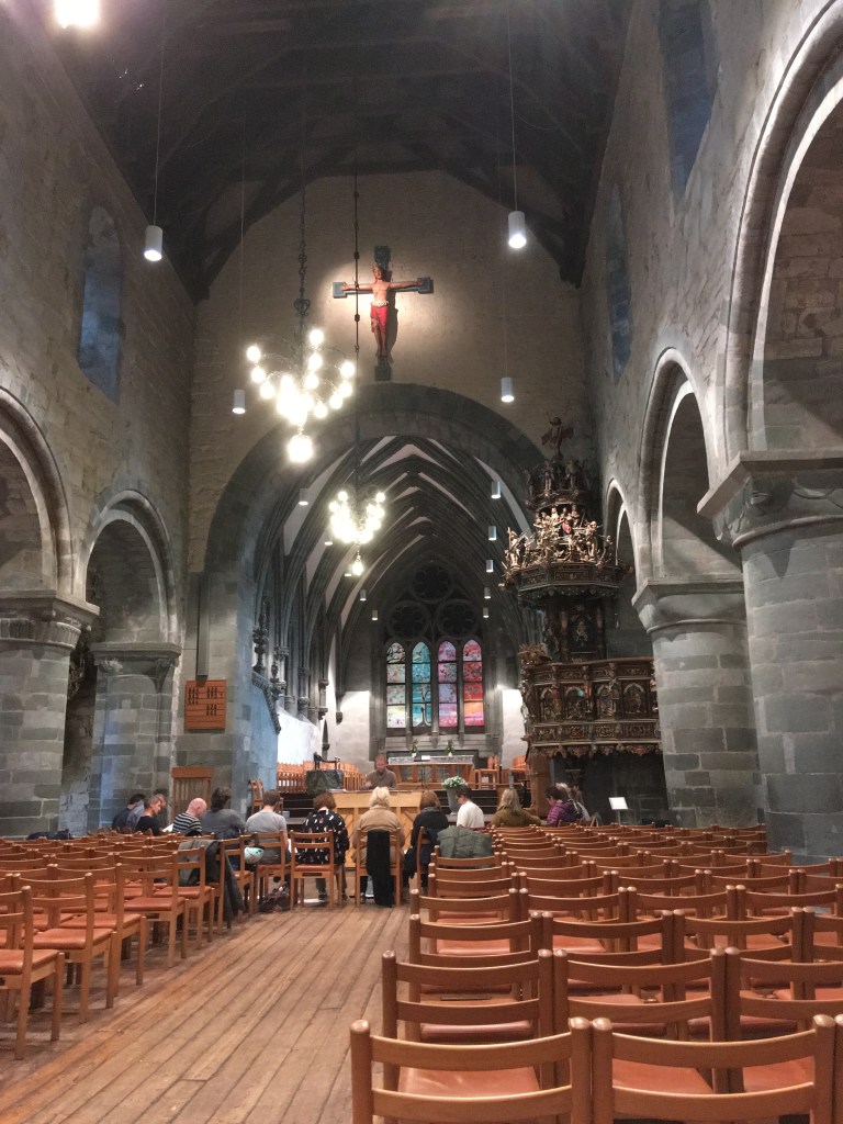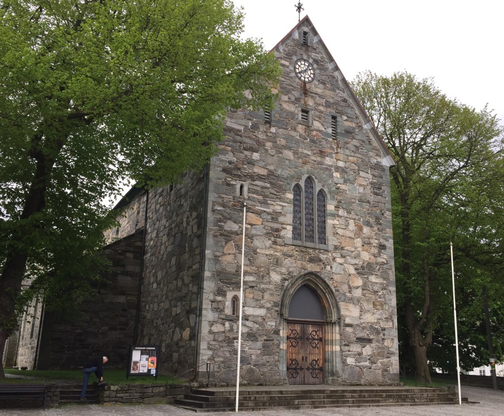Von dort starten wir zum Abendspaziergang in die Stadt. Am Dom ist das Hauptportal bereits geschlossen, aber ein Seitenportal steht offen und wir hören Chorgesang. Wir schleichen uns in den Dom und lauschen einige Zeit der Chorprobe. Danach geht es zum Hafen und in die Altstadt. Natürlich darf trotz des Nieselregens ein Besuch der „Ovre Holmegate“ mit ihren bunten Häusern nicht fehlen. Nach dem Verlassen eines sehr urigen kleinen Cafés stellen wir mit Erschrecken fest, dass wir unseren Schirm im Dom vergessen haben. Also eilen wir zurück zum Dom, dort sind nun alle Türen verschlossen, aber … im Untergeschoss „tagt“ der Chor und eine Raucherin (Sängerin des Chors) öffnet uns auf unsere Bitte hin das Portal und wir können mit unserem Schirm bewaffnet zum Camping zurücklaufen.