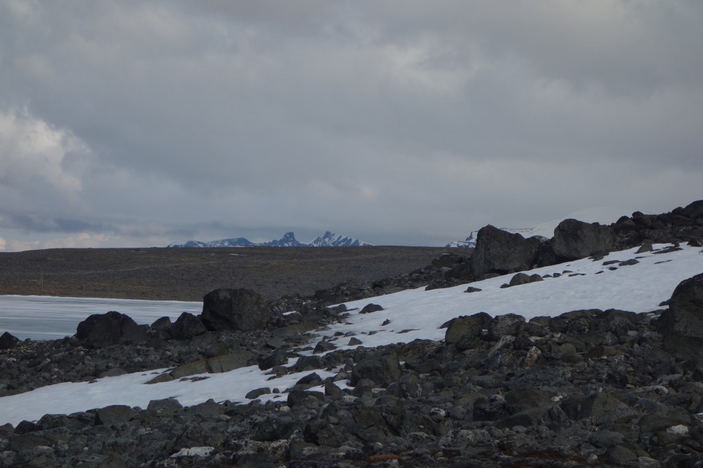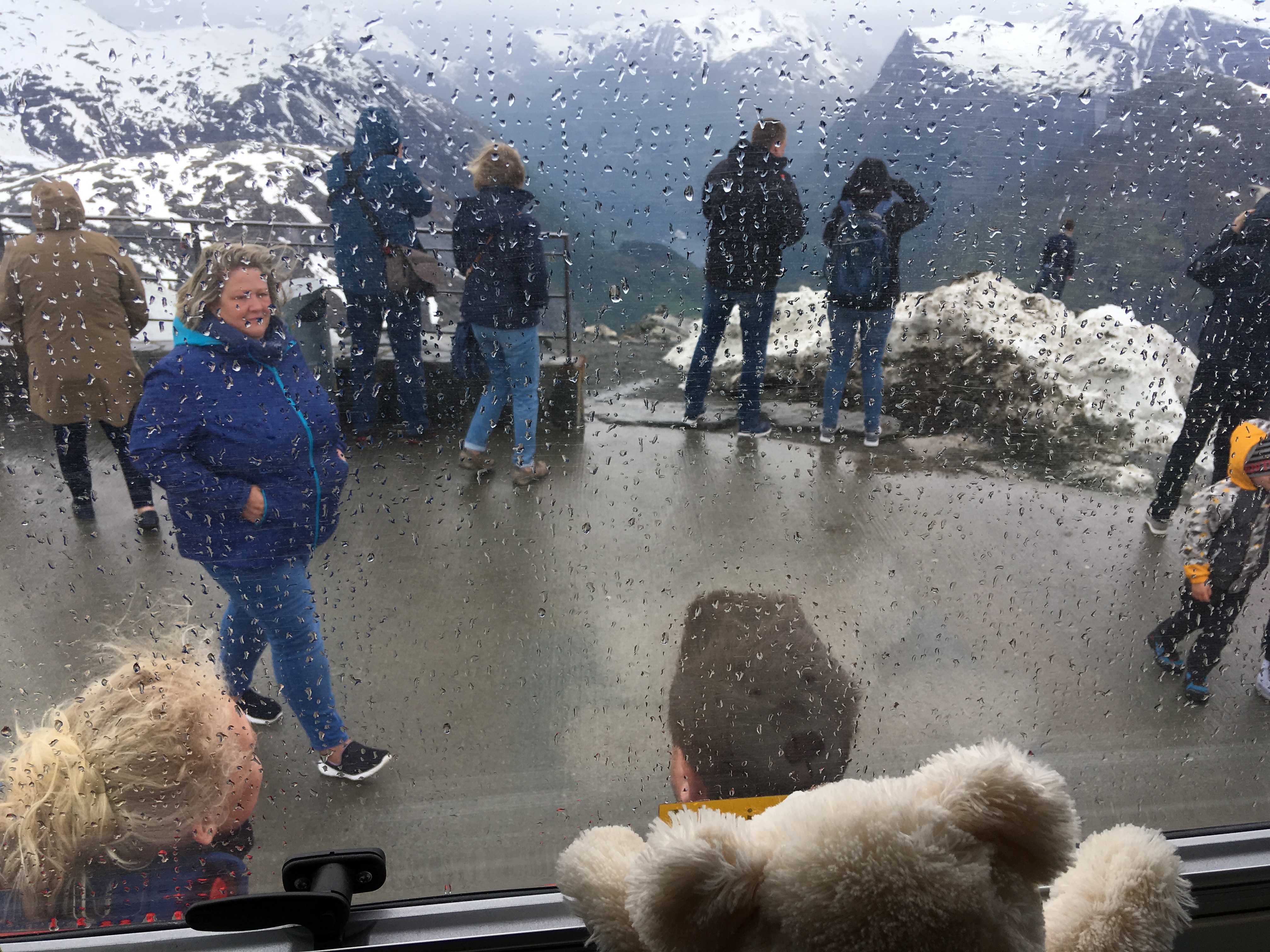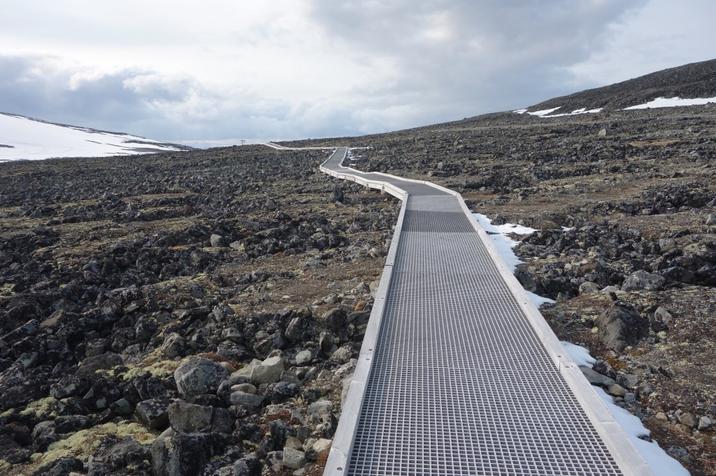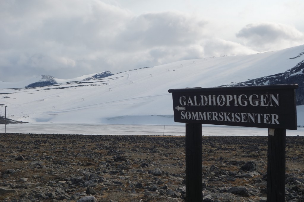 Kaum sind wir unterwegs, stehen wir vor eine Tunnelbaustelle . Wir müssen warten, bis uns ein „Führungsfahrzeug“ hindurch leitet. Es geht weiter übers Sognefjell (Passhöhe 1434m). Nach der Sagasäule biegen wir rechts ab zum Galdhopiggen-Sommerski-Senter. Über eine steile, private Mautstraße geht es ins Skigebiet auf 1850 m. Die Pistenpräperierungsarbeiten laufen in vollem Umfang – mehrere Schneekatzen sind im Einsatz – allerdings läuft heute kein Lift. Wir spazieren über einen langen Steg über den Permafrostboden zum Einstieg in die „Gletscherwelt“, die aber leider geschlossen ist.