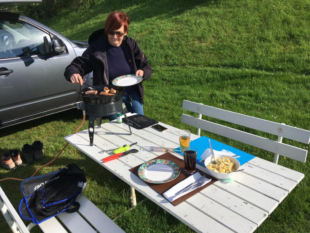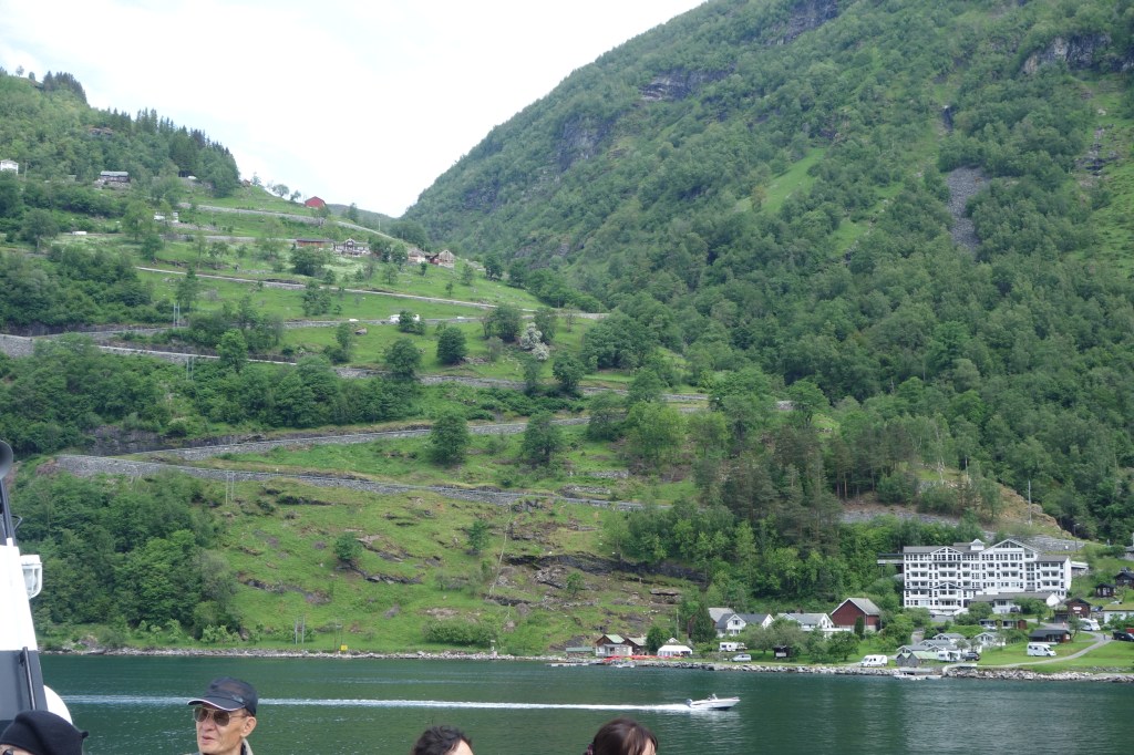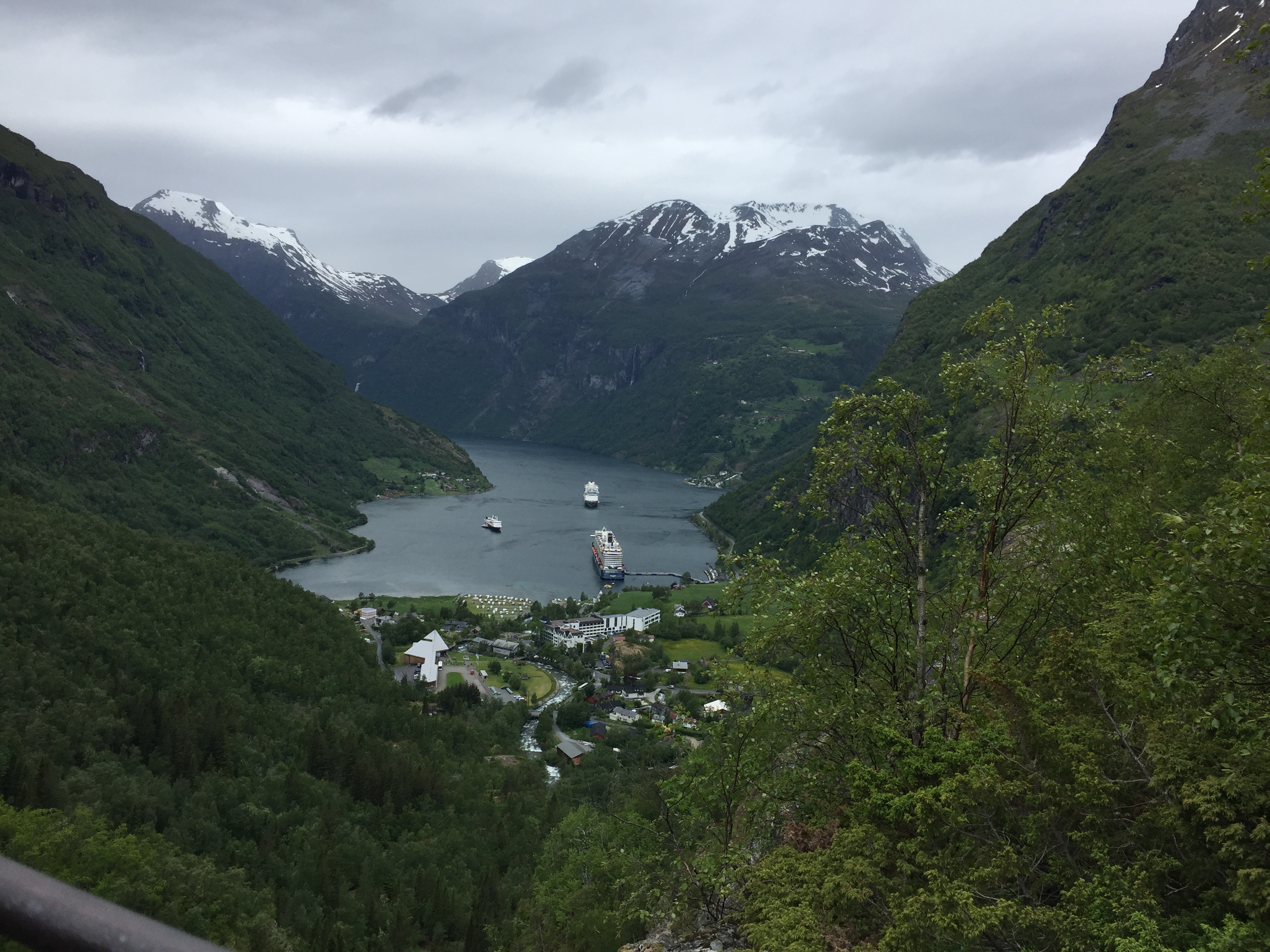 Dann gehts viele, viele Serpentinen hinunter in den Ort Geiranger auf den Stellplatz direkt am Hafen. Tatsächlich reißt der Himmel auf und wir wandern in der Abendsonne zum Grand Fjord Hotel, um meinen Geburtstagsgutschein einzulösen. Bei einem herrlichen Blick über den Fjord genießen wir das „skandinavische Buffet“