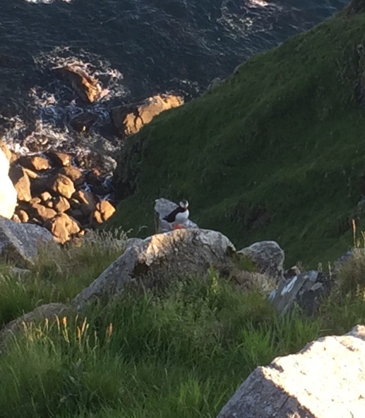 Also gehen wir nach dem Abendessen los, erst einmal den steilen Berg hinauf und dann weiter über das Hochplateau immer den Wegweisern und den anderen Hobbyornithologen nach. Unterwegs beobachten wir mehrere Skua (Raubmöven). Zielpunkt heute Abend ist jedoch der Fels der Papageientauchern. Die besten Plätze direkt an der Steilküste sind schon besetzt, aber jeder kommt zu seinem Recht – dem Blick auf die kleinen, quirlen Vögeln -, die hier zu Hunderten herumfliegen. Ein toller Abschluss für diesen Tag.