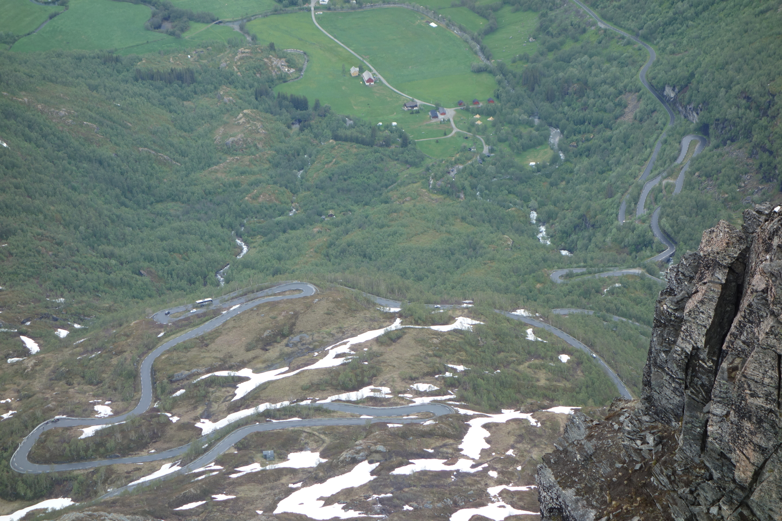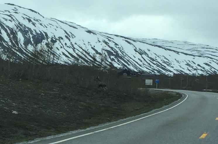 Über die 63 geht es weiter bis zum Aussichtspunkt Dalsnibba. Und unterwegs sehen wir tatsächlich einen Elch am Straßenrand. Dirk dreht bei der nächsten Möglichkeit, damit wir „unseren“ Elch fotografieren können. Leider ist er sehr Kamerascheu, wie ihr oben gut sehen könnt.