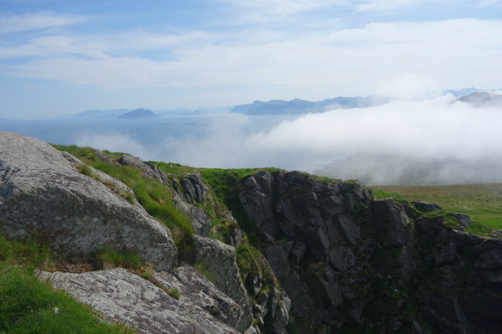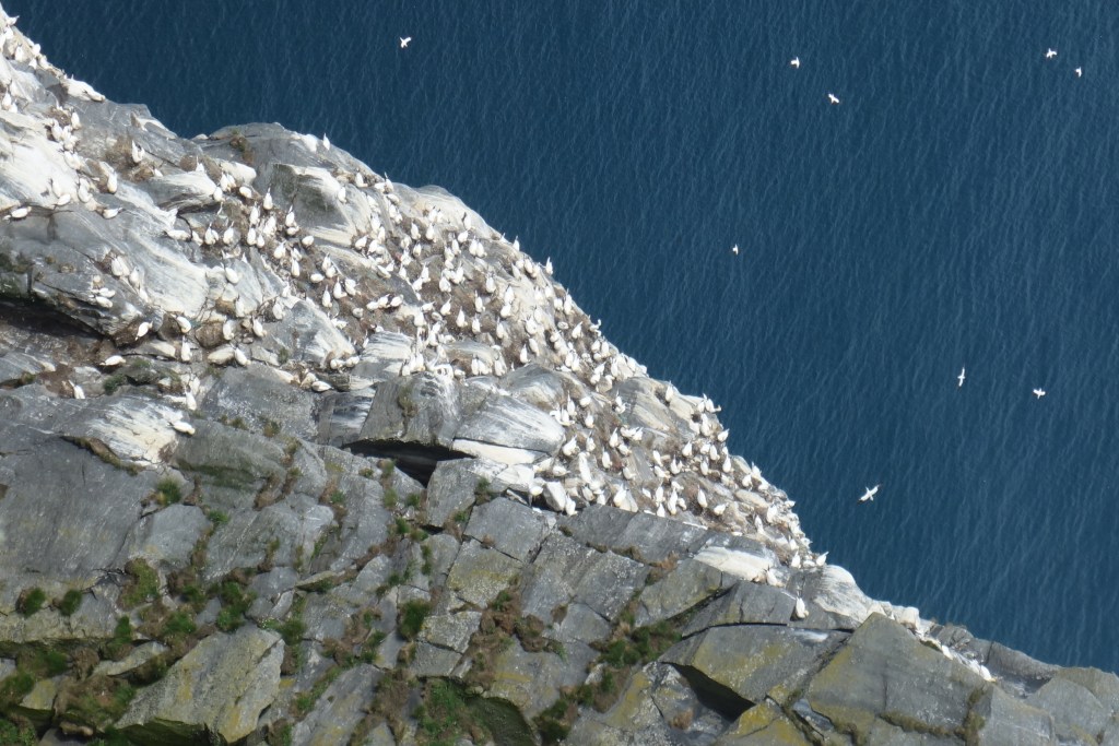 Bei strahlendem Sonnenschein erklimmen noch einmal das Plateau der Insel Runde und wählen jetzt den Rundwanderweg durch das Hochmoor zu den Vogelfelsen. Das Wetter hat sich verändert und Nebelschwaden und Wolken umhüllen uns, die die Landschaft noch eindrücklicher und stimmungsvoller gestalten. Am Klippenrand empfängt uns das Geschrei tausender Seevögel und dann sehen wir sie auch, wie sie über dem blauen Meer schweben. Wenn wir uns trauen über die Abbruchkante der Steilkünste zu schauen, können wir in die Brutkolonien der Dreizehenmöven und der Basstölpel unter uns klar erkennen. Unterwegs können wir auch einen Kormoran und ein Seeadlerpaar beobachten. Aber auch der herrlichen Panoramablick auf die uns umgebende Inselwelt belohnt den Aufstieg.