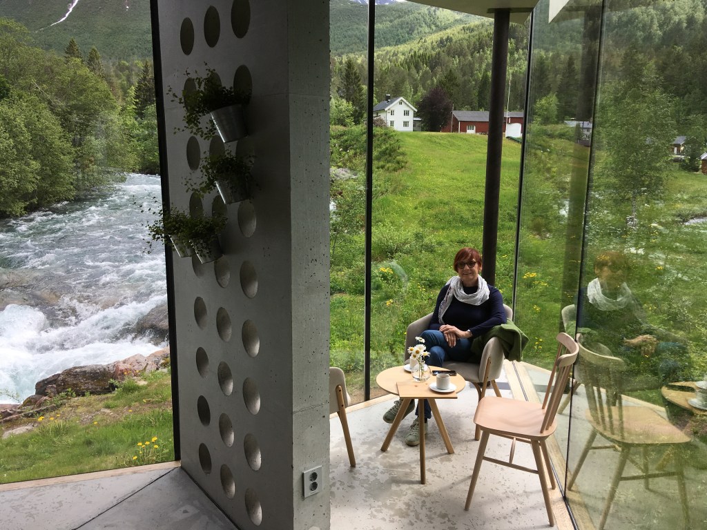Unser Mittagsrastplatz bietet einen Blick über den Noralsfjord in den Sunnylvsfjord. Kaffee gibt am Gudbrandsjuvet in dem hübschen, sehr modernen und etwas futuristisch anmutendem Bistro.