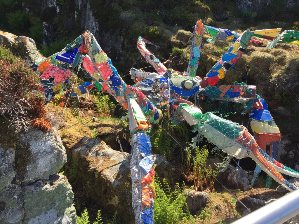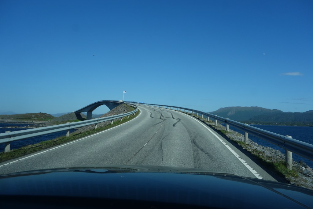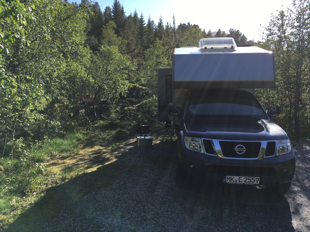 Die Atlantikroute gilt als eine der schönsten Autostrecken dieser Welt und verbindet wie eine Perlenkette die kleinen Inseln und Schären mit zum Teil äußerst bizarren Brücken. Es gibt diverse Möglichkeiten auszusteigen und das Zusammenspiel von Wasser, Fels und kargem Bewuchs auf sich wirken zu lassen. Auf dem Atlanterhavsvegen, einem gut angelegten Spazierweg, treffen wir auf eine Riesenkrabbe aus Plasikmüll: Eine Mahnung und Erinnerung an unsere Verpflichtung zum Umweltschutz! Über die 255 und enge Waldwege geht es weiter zu unserem Übernachtungsplatz Roksetskaret mitten in einem großen Waldgebiet.
