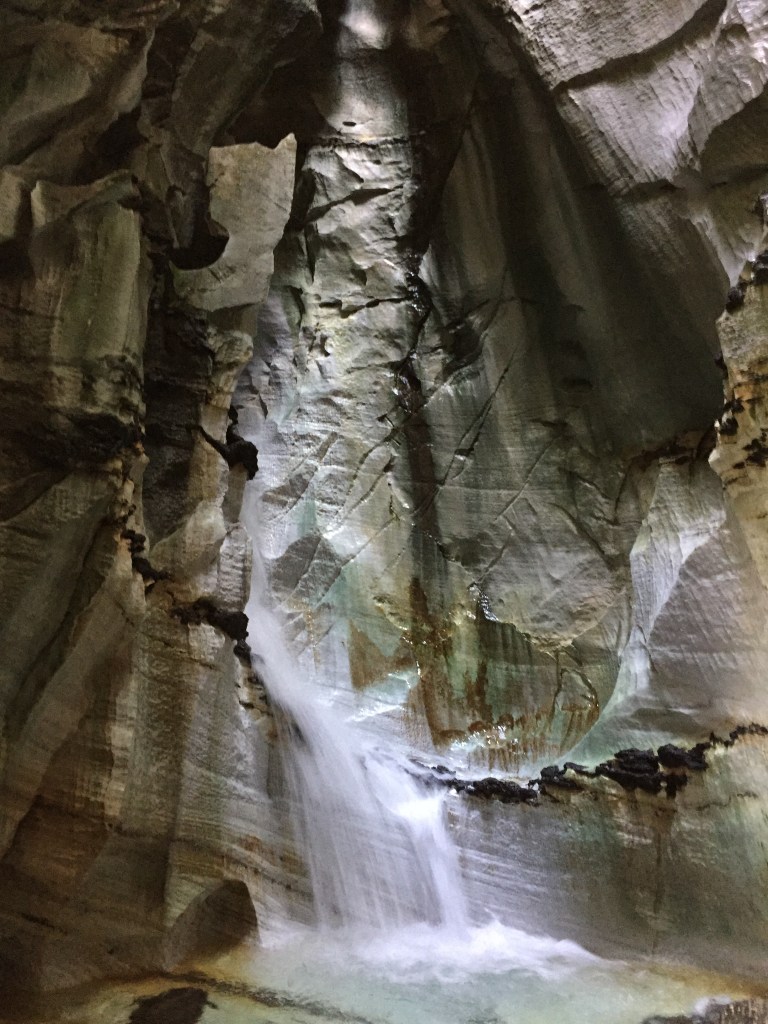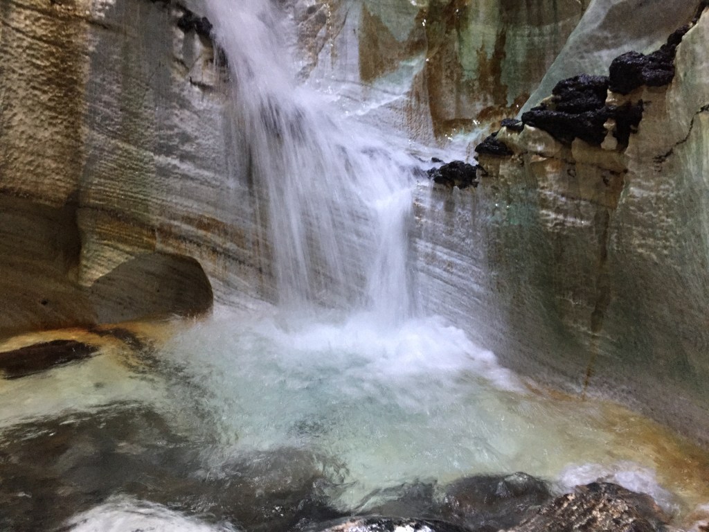 Dort steigen wir über eine Alu-Leiter hinab in die 2. Höhle in ca. 516 m Höhe liegt und sind sprachlos. Der Aufstieg und die müden Beine sind vergessen, der Anblick ist wirklich fantastisch. Dunkler Granit, weißer Marmor, gelbe und ockergelbe Färbungen im Fels, der kleine Wasserfall, der in die Höhle hinab rauscht, und die Sonnenstrahlen, die durch eine kleine Öffnung ins Innere fallen. Echt beeindruckend! Wir verabschieden uns wehmütig von diesem magischen Ort. Den Anstieg zur 3. Höhle weiter oberhalb lassen wir aus und machen uns auf den Rückweg, wobei Dirk es doch nicht lassen kann auch noch der 1. Höhle einen kurzen Besuch abzustatten.