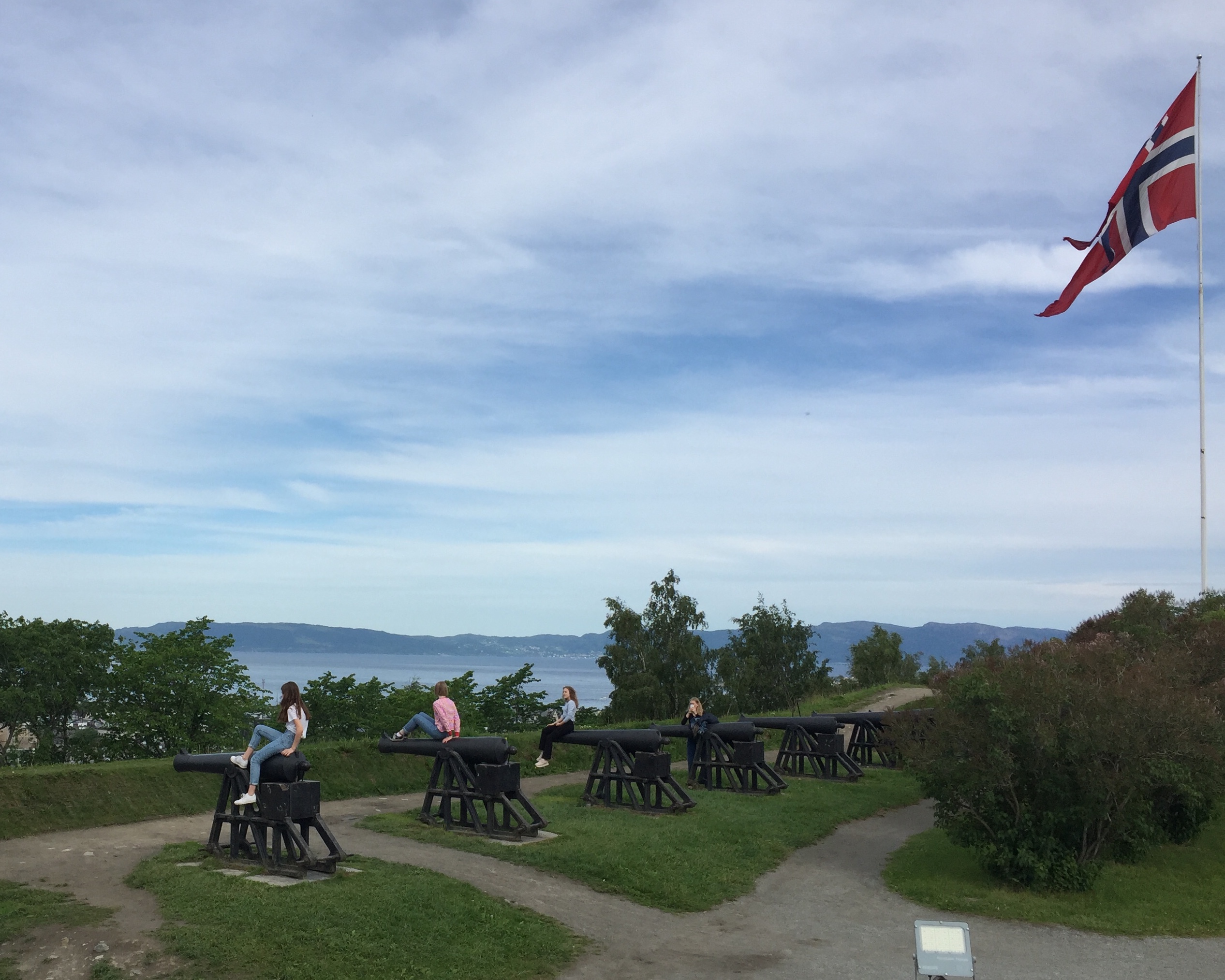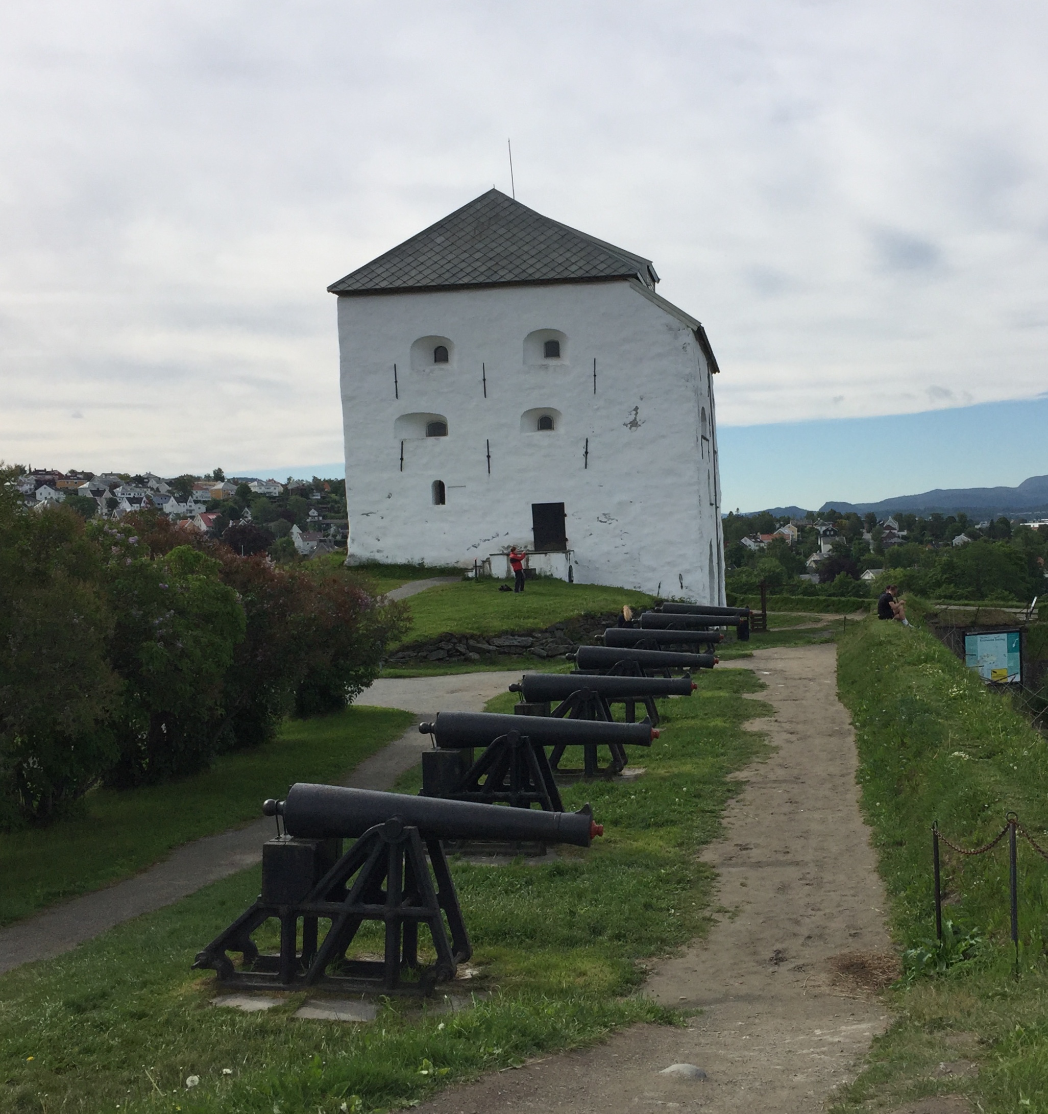 Wir starten ohne Frühstück, da es hier in Trondheim angeblich eine super Bäckerei gibt. Frische leckere Brötchen wären schon schön und so machen wir uns auf die Suche. Fündig werden wir unterhalb der Festung Kistianstan und so wird auf dem dem Festungsparkplatz erst einmal gefrühstückt. Gut gestärkt spazieren wir durch die Festungsanlage und genießen den schönen Ausblick über die Stadt und aufs Meer. Trondheim ist unser Wendepunkt und somit der nördlichster Punkt unserer Norwegenreise.