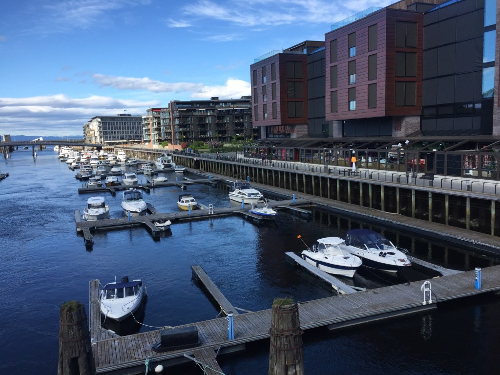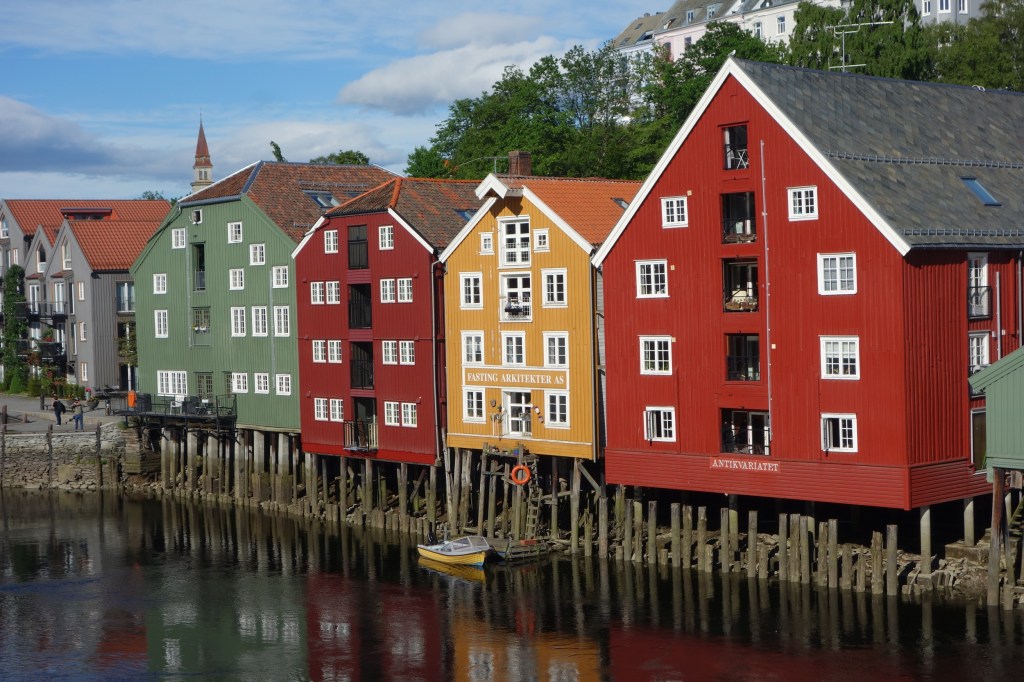 Der Dom, die Altstadt, der Hafen, das Kjopmannsgate und die Neustadt sind schnell erreicht. Trondheim gefällt uns sehr gut, vielleicht liegt es am Sonnenschein, vielleicht aber auch daran, dass die Stadt bei unserem Besuch nicht so von Touristen übervölkert ist wie z.B. Bergen. Besonders gut gefällt mir die gelungene Verbindung von alter Bausubstanz mit neuen modernen Elemente und die moderne Hafenpromenade mit mediterran anmutender Außengastronomie.