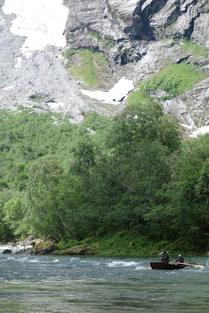 Es ist trocken und so entscheiden wir uns für auf dem Parkplatz vorgeschlagene kleine Rundtour Nr. 9 entlang des Rauma zum Eiafossen. Unterweg beobachten wir eine Ruderboot mit Anglern, dass unterhalb der Stromschnellen den Fluß quert. Die uns umgebende Bergwelt mit ihren schroffen, bizarren Felswänden ist beeindruckend. Weiter unterhalb treffen wir auf den Angler, der uns erklärt, dass nur Personen mit großer Erfahrung in der Lage sind, den Fluss an dieser Stelle trotz der Stromschnellen zu queren.