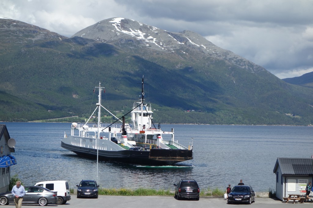 Weiter geht es über Andalsnes. Mit der Fähre setzen wir von Farnes nach Solsnes über und fahren – durch einen Tunnel unter dem Fannefjord hindurch – zum Wanderparkplatz Vaden hoch über Molde.