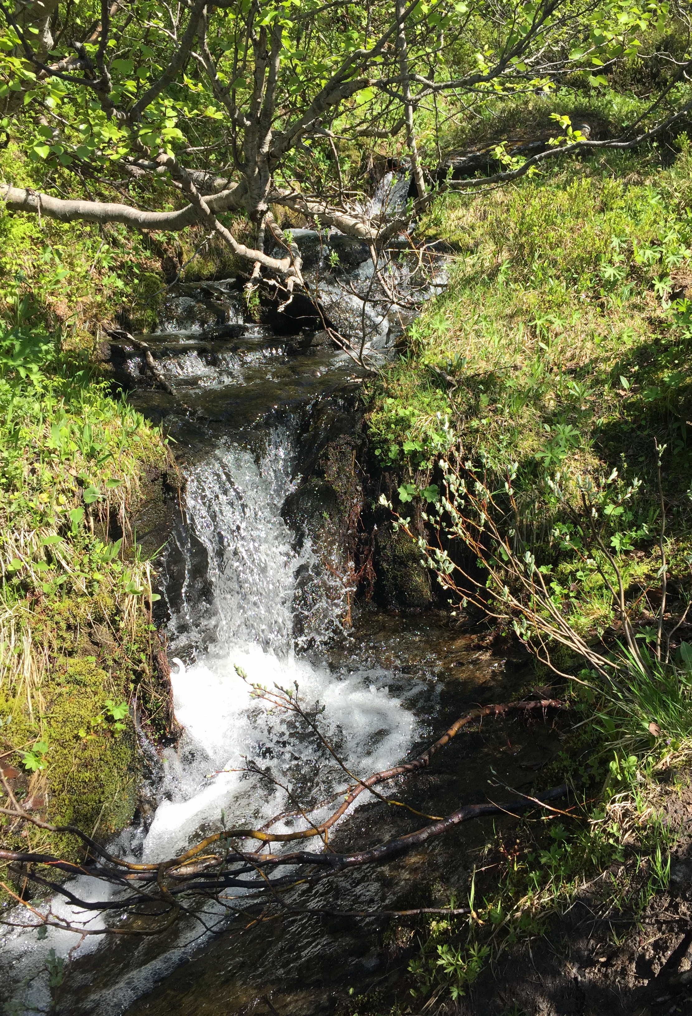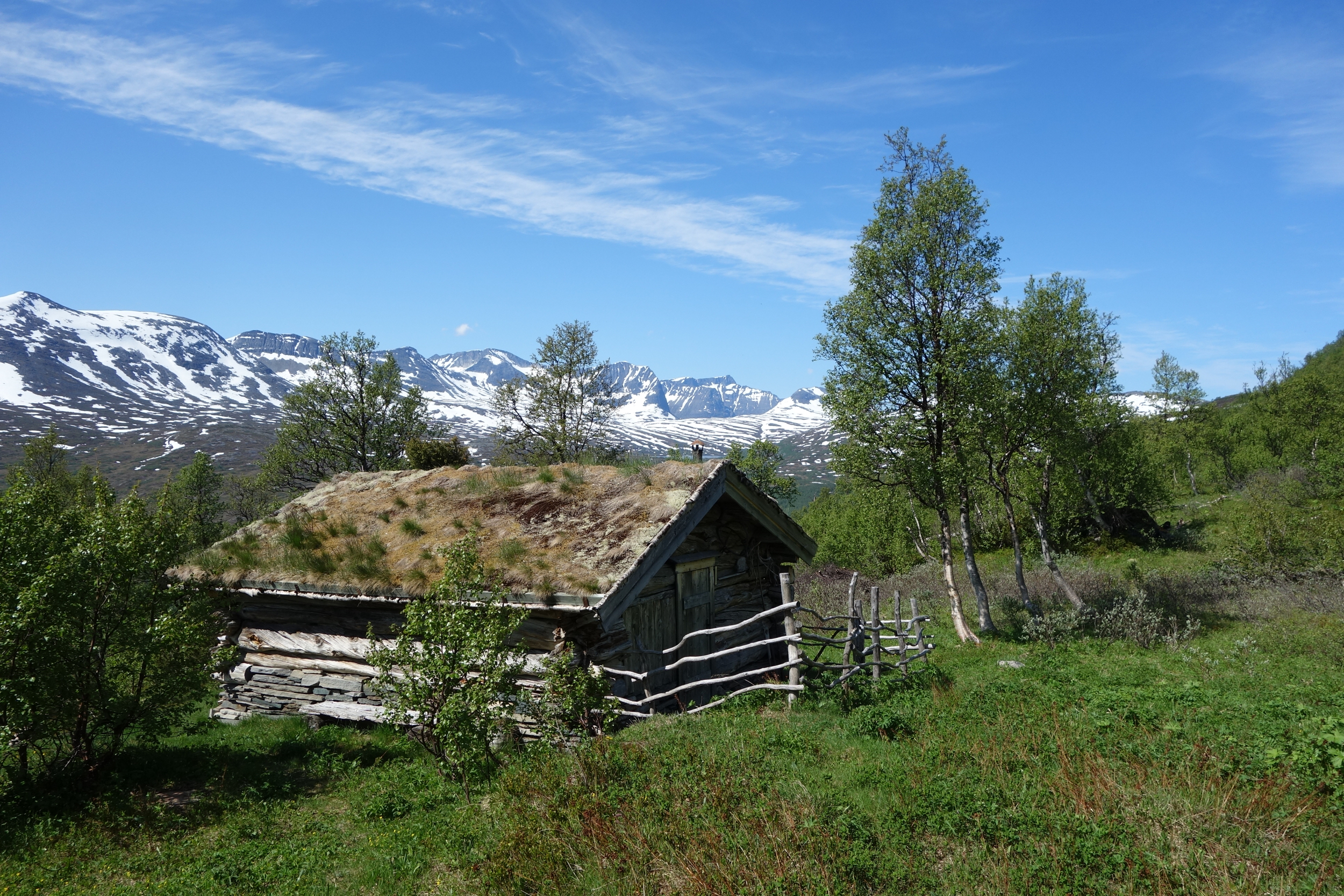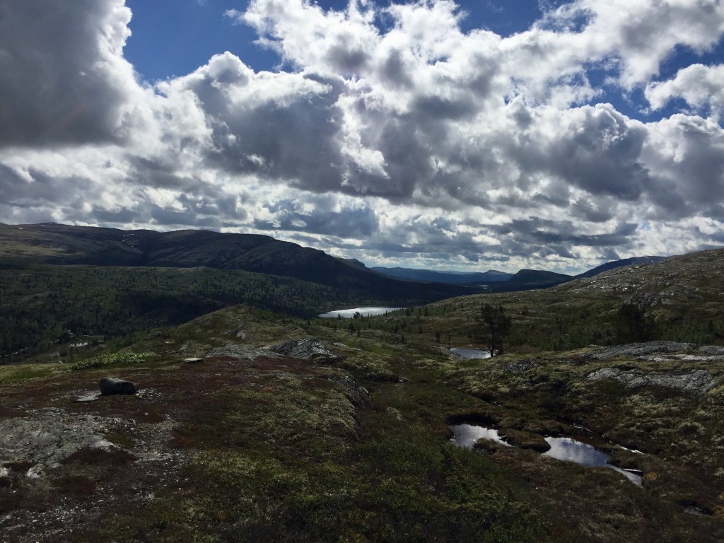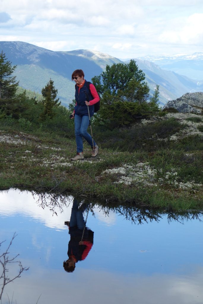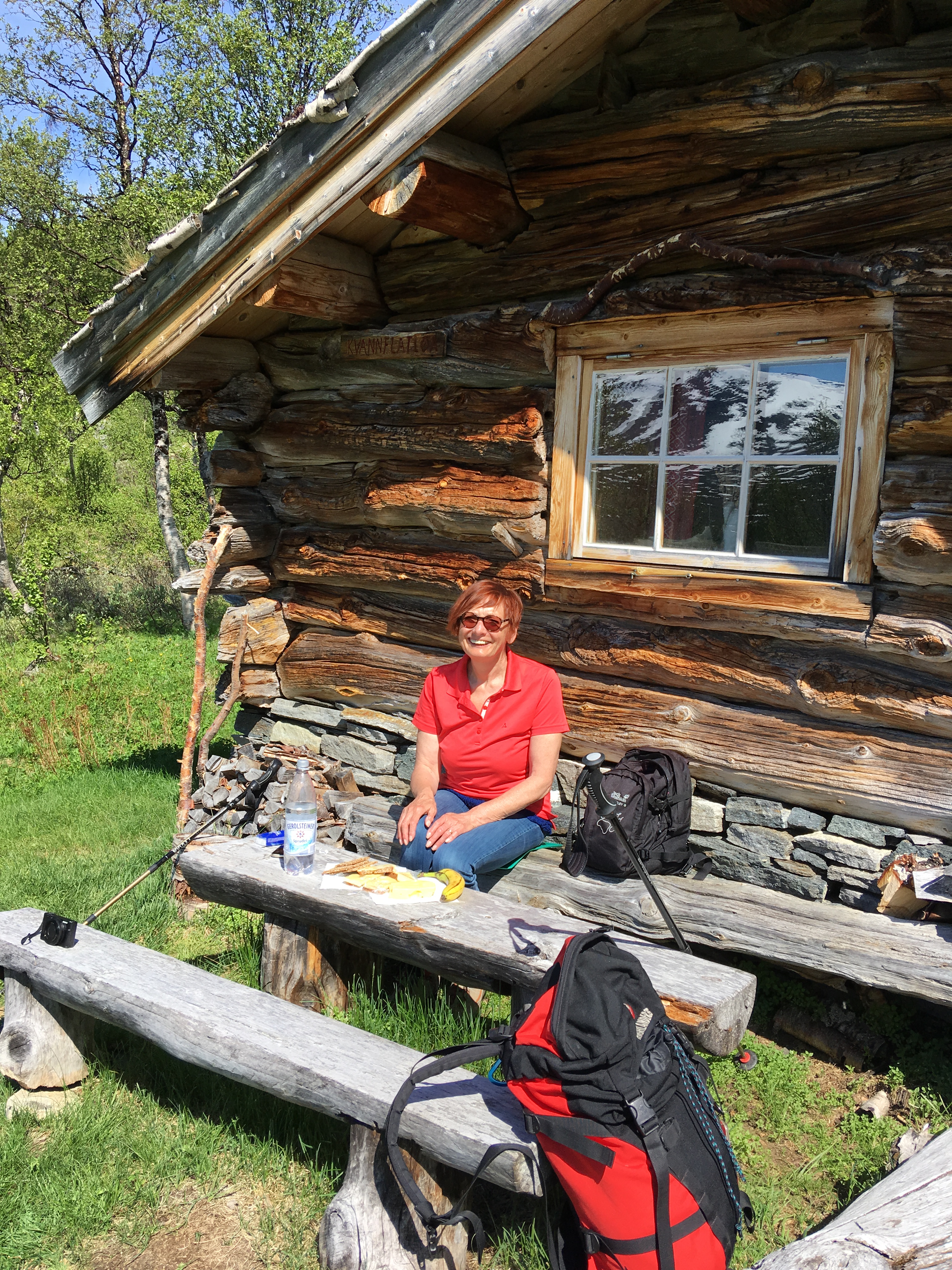 Storli ist für ich wie ein lebendiges Heimatmuseum. Ein kleines, ruhiges, ursprüngliches Dörfchen am Ende der Fahrstraße in einem lieblichen Tal umgeben von Bergen, deren Spitzen immer noch mit Schnee bedeckt sind. Wir machen uns auf zu einer Wanderung zur Kvannflatloa-Hütte. Laufen erst einmal weit oberhalb der Talstraße Richtung Talausgang und steigen dann durch lichten Birkenwald bergauf. Kleine und größere Bäche müssen überquer werden. Wie auf allen unseren Wanderungen gibt es auch hier Hochmoorstellen – festes Schuhwerk ist angezeigt -. Es ist so still, nur das Zwitschern der Vögel und ab und zu das Blöken der Schafe und das Bellen der Hunde unterbrechen die Ruhe. Frühlingsblüher wie Buschwindröschen sind voll in der Blüte.