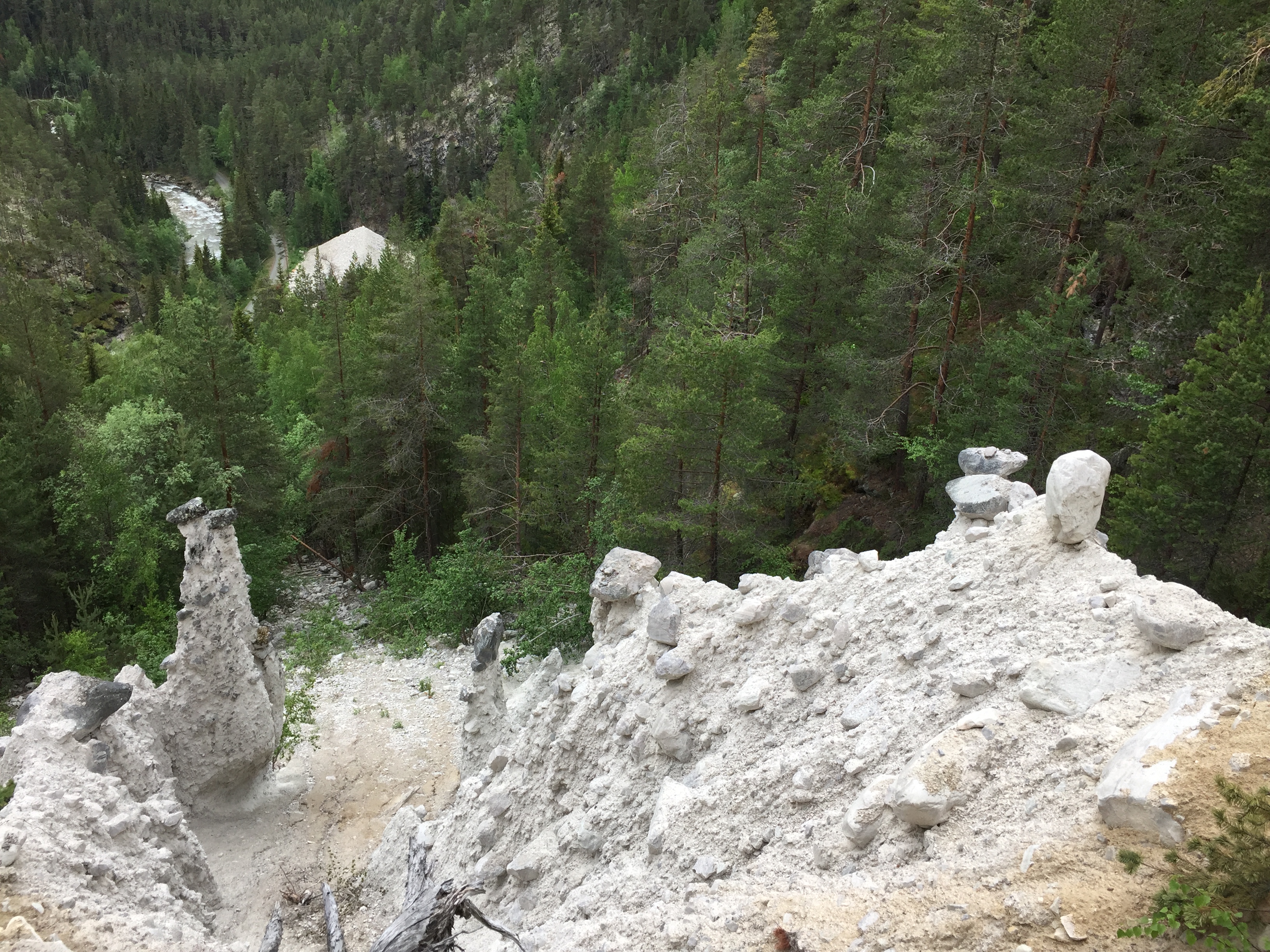 Wieder bei Bimo angekommen, geht es weiter über die E6 in Richtung Otta. Kurz vor Otta biegen wir ab auf eine Privatstraße (Maut 4 €). In Uladal klettern wir einen streilen Pfad und mehrere Treppen hinauf und besichtigen die weißen Konglomeratsäulen mit den schwarzen Hüten, die „weißen Priester„!