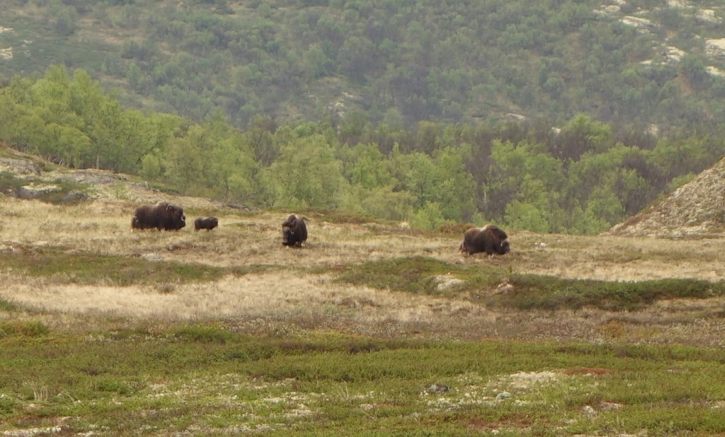 Wir laufen weiter bergan, die Birkenwälder werden lichter und wir wandern an kleinen Schneefeldern vorbei. Und dann sind wir oberhalb der Baumgrenze. Die Vegetation wird deutlich geringer, Flechten und Mose mit ihren teilweise winzigen Blüten bestimmen das Bild und wir haben einen super Rundblick ins Land hinein. Jedoch, nirgends sind Moschusochsen zu erblicken, so sehr wir auch Ausschau halten. Auf unserem Rückweg – der Himmel hat sich drohend verdunkelt – sehen wir dann zu unserer großen Freude eine kleine Herde mit einem Ochsen und vermutlich zwei Kühen und Kälbern. Bei der majestätischen Größe der Tiere sind wir froh, dass eine erhebliche Distanzstrecke zwischen uns liegt.