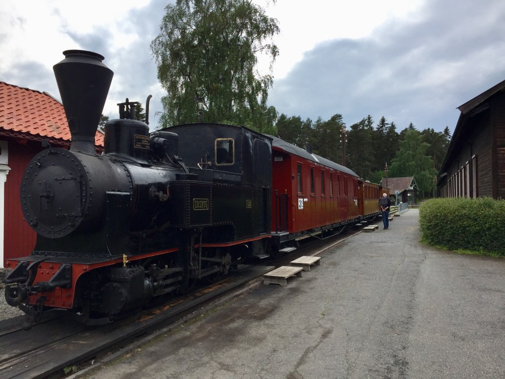 Kurz vor Lillehammer befindet sich das Norsk Vegmuseum. Selbst für mich technisch völlig uninteressierten Menschen ist der Besuch des Museums etwas ganz Besonderes. Neben den vielen historischen, ausrangierten Straßenbaumaschinen gibt es ein kleines historisches Dorf mit einem Kaufladen aus dem 19. Jahrhundert, in dem ein Kaufmann – passend gewandet – uns seine Schätze sehr eindringlich und mit kompetenter Bewerbung zum „Kauf“ anbietet. Es gibt einen weiteren kleinen Kaufladen – nebst entsprechend gekleideter Verkäuferin in Kittelschürze – aus den 50ziger Jahren des vorigen Jahrhunderts. Der Schmied in „Ausbildung“ zeigt uns gerne die Schätze seiner kleinen Schmiede – besonders der Blasebalg weckte Dirks Interesse – und schmiedet für uns einen kleinen Haken. Es gibt eine gut eingerichtet Werkstatt mit Ambos, Drehbank, Bohrmaschine etc, eine Remise mit Kutsche und Stall.