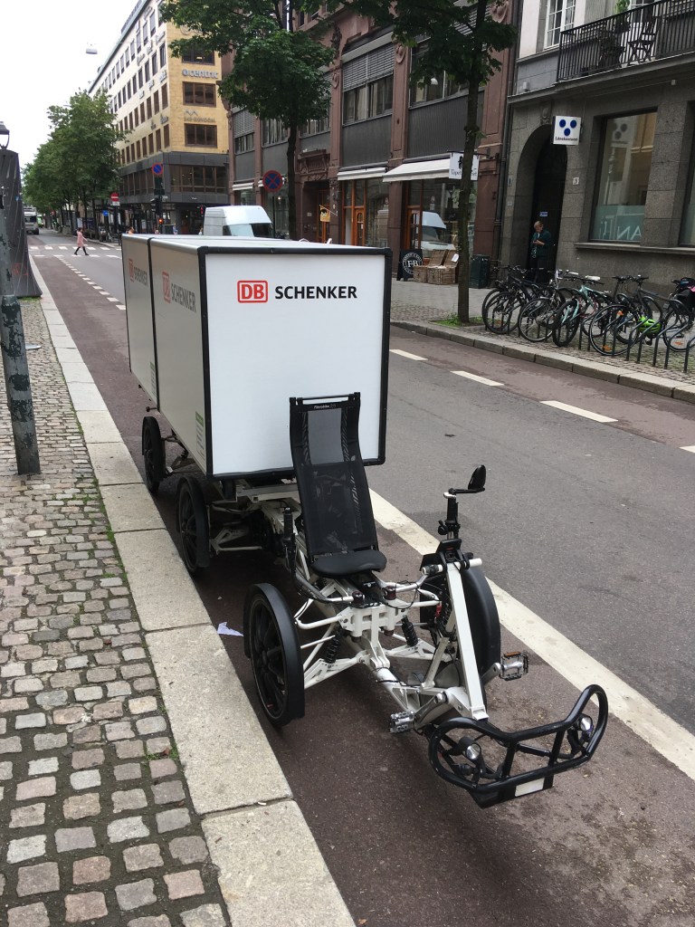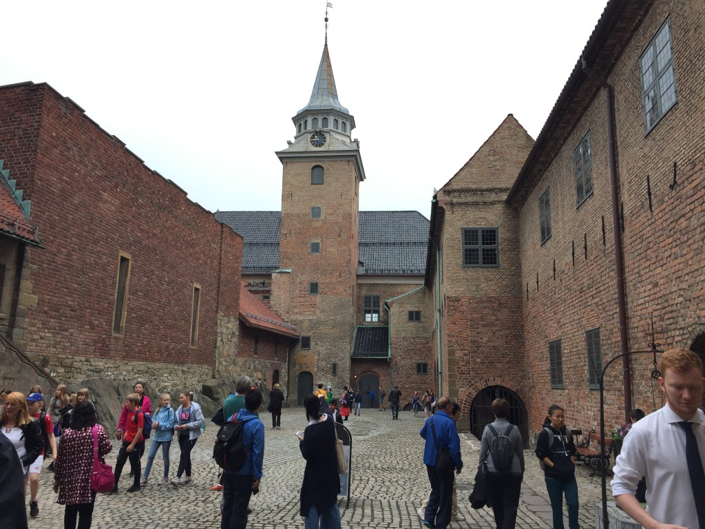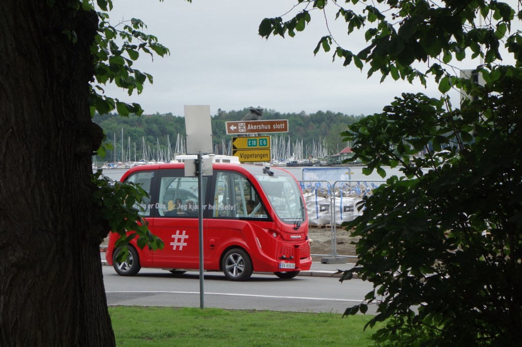 Auf dem Weg zur Festung sehen wir viele Elektroroller, einen selbstfahrenden kleinen Bus und ein seltsam anmutendes Auslieferungsfahrzeug der Firma Schenker. Nach der Besichtigung der Festung Akershus fahren wir mit Straßenbahn und Fähre zur Museumsinsel Bygdoy.
