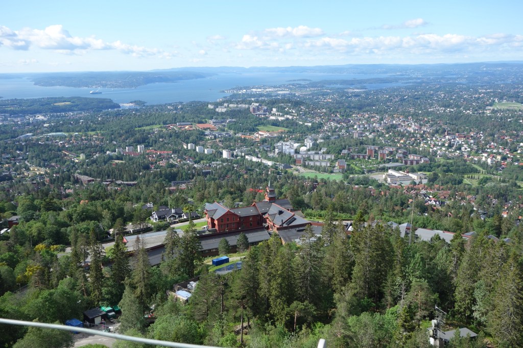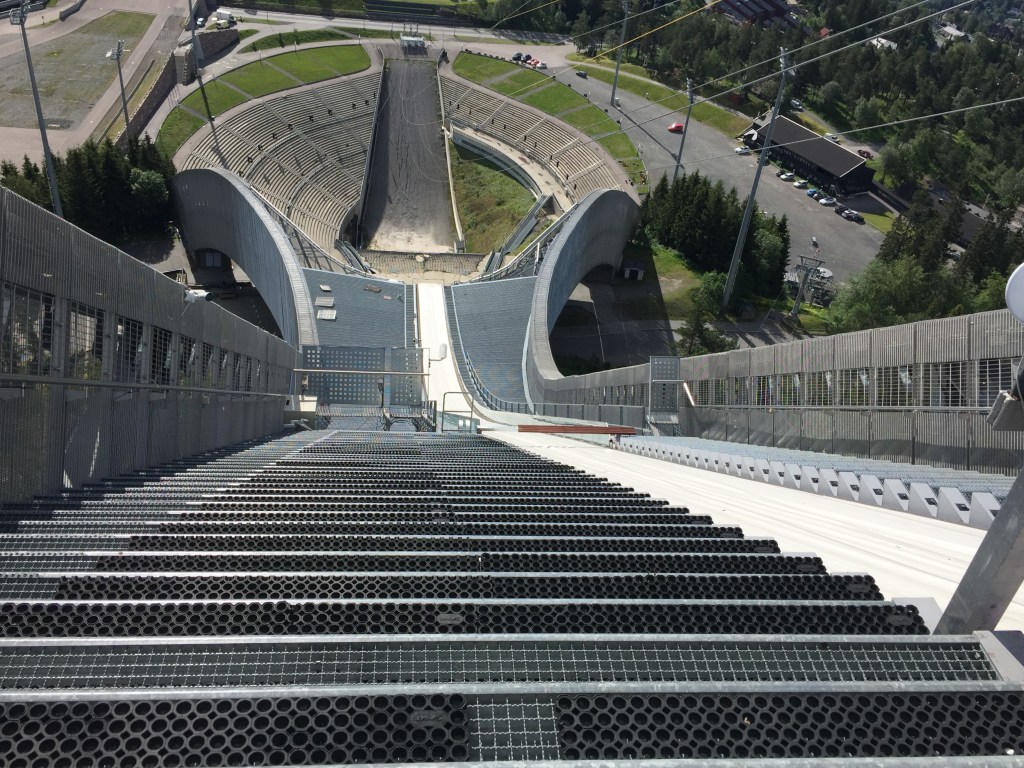 Weiter geht es über die E6 bis Oslo. Natürlich – wir hätten es eigentlich wissen müssen, aber man probiert es ja immer wieder – finden wir in der Stadt keinen Parkplatz, also geht es zum Holmenkollen. Eine gewaltige Schanzenanlage, von Ferne erinnert sie mich ein wenig an eine riesige, urzeitliche Exe.
