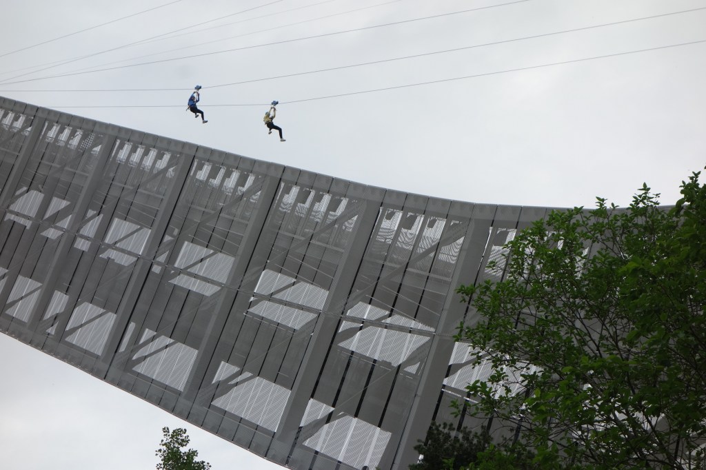 Wir sind sehr erstaunt, wie frei wir uns auch hier auf dem Schanzengelände bewegen können. Keine Verbotsschilder, kaum Absperrungen. Neben der Schanze befindet sich eine Sommer-Langlaufpiste, auf der auf Rollski trainiert wird.