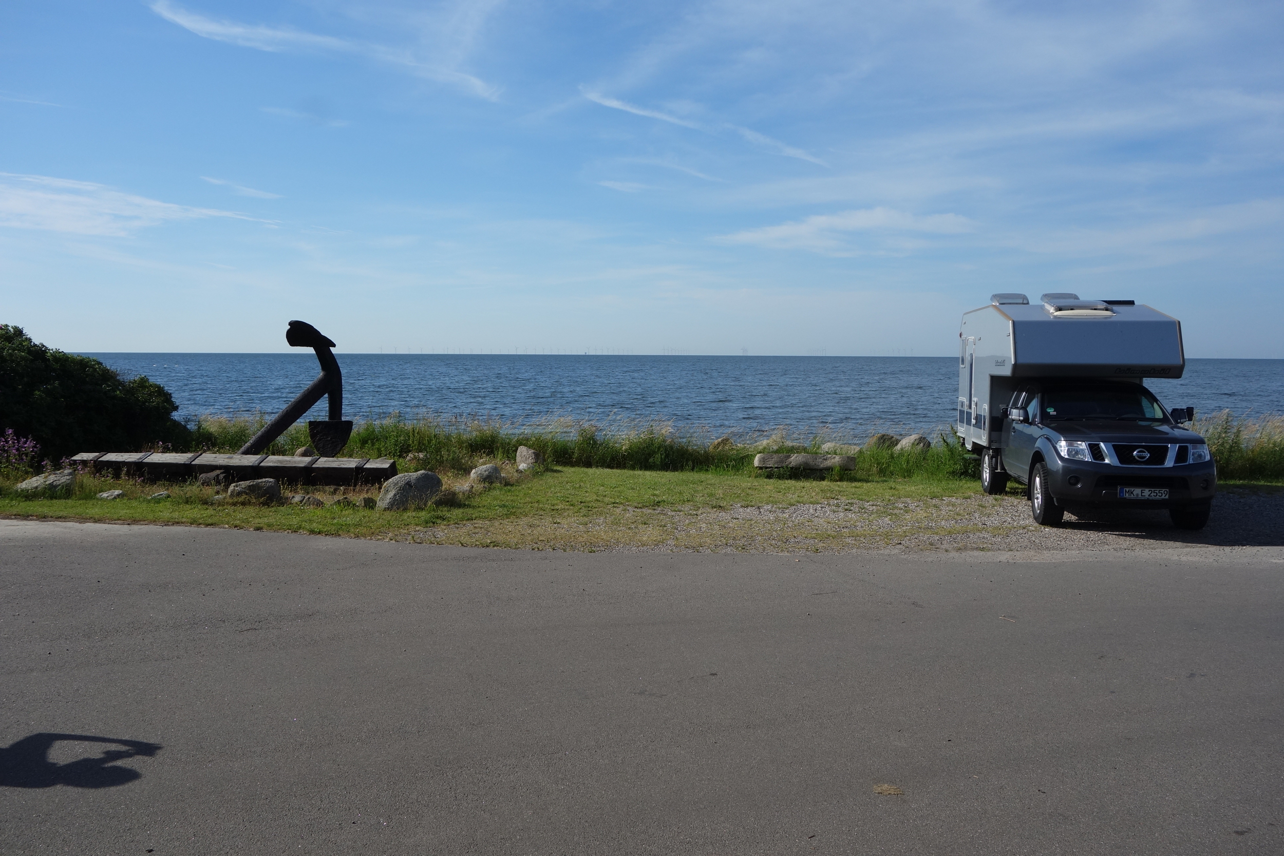 Über die E20 und damit über die Öresundbrücke, fahren wir an Kopenhagen vorbei. Um diese Stadt wirklich kennenzulernen, reicht sicherlich keine kurze Stippvisite auf der Rückfahrt. Zur Mittagsrast besuchen wir den hübschen kleinen Hafen von Greve. Über die Insel Lolland geht’s in das verschlafene Örtchen Subberup. Dort übernachten wir auf einem kleinen, ruhigen Parkplatz direkt an der Ostsee, Aus unserem Wohnzimmer blicken wir auf den dörflichen Hafen und ganz fern am Horizont sehen wir den Windpark Rodsand. Wir trauen unseren Augen kaum, und erst nach dem Blick durch das Fernglas können wir erkennen, dass das Wasser der angrenzende, geschützten Bucht von hunderten Schwänen bevölkert wird.