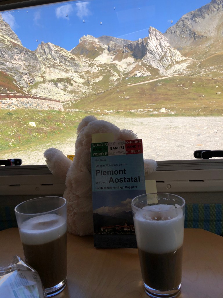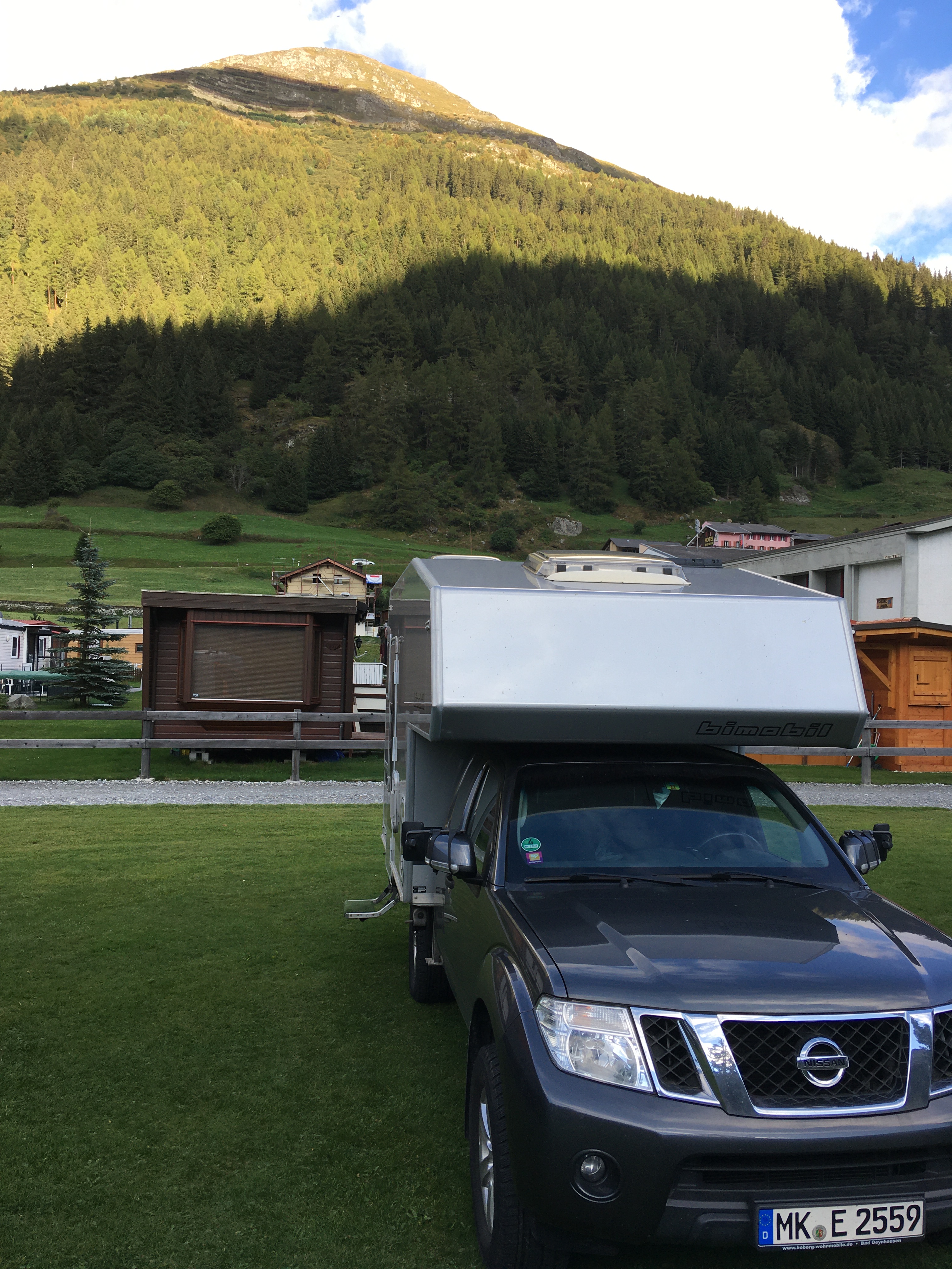 Fr 17.09. 475km 32 Franken Kurzes Einkaufen und Auftanken. Auf dem Parkplatz intressiert sich ein Mann für unsere Kabine. Nach einer kurzen „Führung“ revangiert sich der Brauereivertreter mit einem Probierkästchen. Über die E35 nach Basel. An der Grenze nur eine freundliche, junge Frau, die uns die Vignette verkauft (Nimmt aber nicht unsere „alten“ Frankenscheine, die wir 2014 getauscht haben). Weiter über die Autobahn 3, vorbei am Genfer See und Montreux, zum Camping „DU GD-ST-BERNARD“ (Bezahlung mit den alten Franken 😉