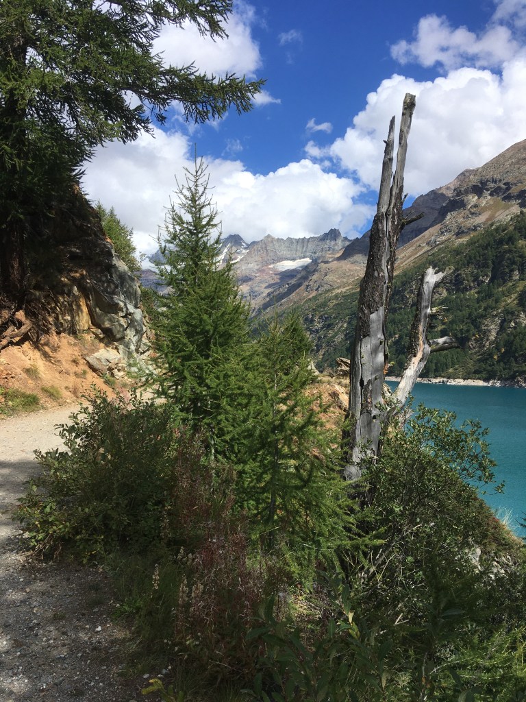 Sa 18.09. 67km 2,50€ Jetzt gehts über den großen St. Bernard nach Italien! Kurz vor Aosta biegen wir links ins Gebirge ab und erreichen – ohne eine Bäckerei gefunden zu haben – den Lago di Place Moulin auf ca. 2000 Höhenmetern. Eine Wanderung führt uns längst den See zum Rifugio Prarayer. Wir übernachten auf dem Parkplatz oberhalb der riesigen Staumauer.
