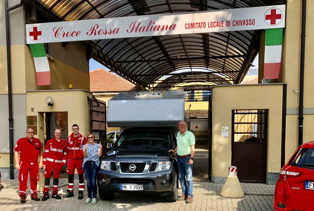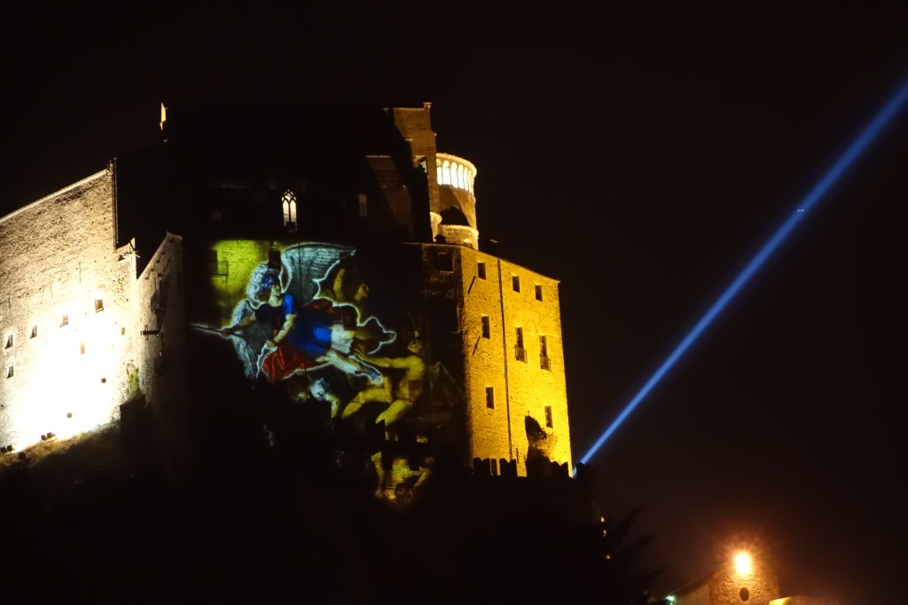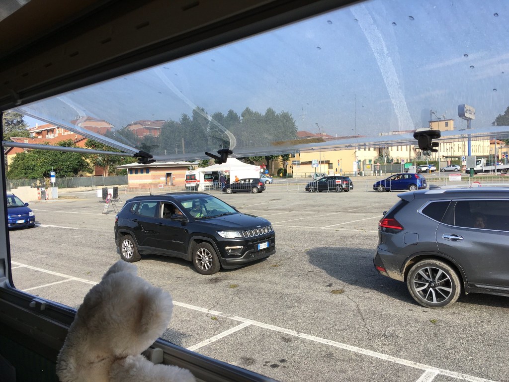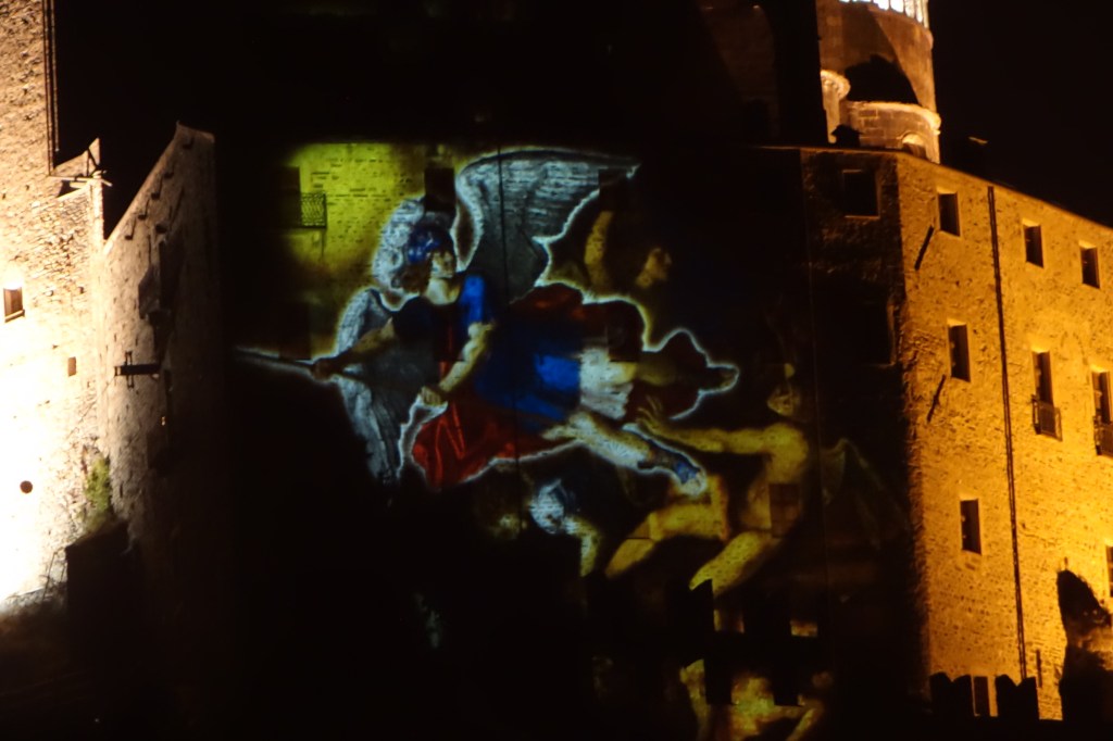 Di 28.09. 92km Ab 9:00 Uhr öffnete das Testzelt des Roten Kreuzes und der Autokorso setzte sich in Bewegung. An der Ver- und Entsorgung streikte der Trinkwasserhahn. Ein Rotkreuzler nahm uns darauf mit ins nahegelegene Quartier und versorgte uns mit Wasser. Nach einen Fotoshooting fuhren wir über die Autobahn nach Avigliana. Dort wanderten wir zur Burgruine und durchs Dorf. Abends fuhren wir auf den kleinen Parkplatz zum Aufstieg zum Sacra di san Michele. Nach unserem Abendessen kamen immer mehr Autos. Die Leute wanderten mit Taschenlampen bewaffnet zum Kloster. Neugierig schlossen wir uns der Prozession an. Mit Lasern wurde das Bild des heiligen St. Michael an eine Außenwand geworfen. Der Blick weit ins Tal war atemberaubend.