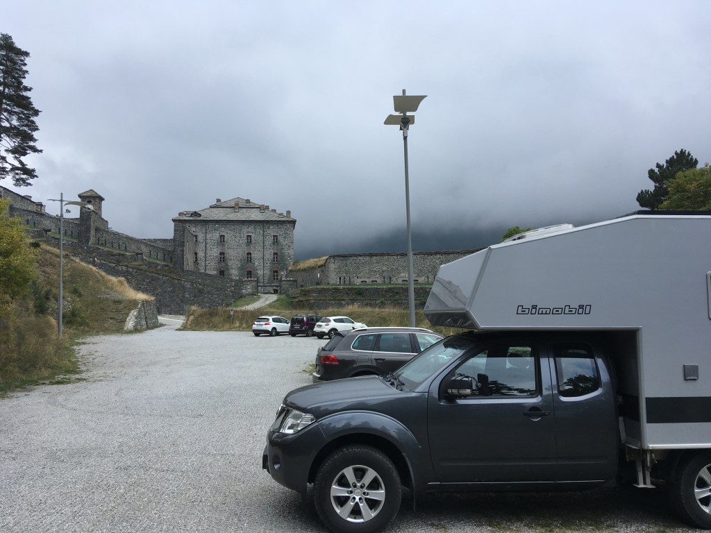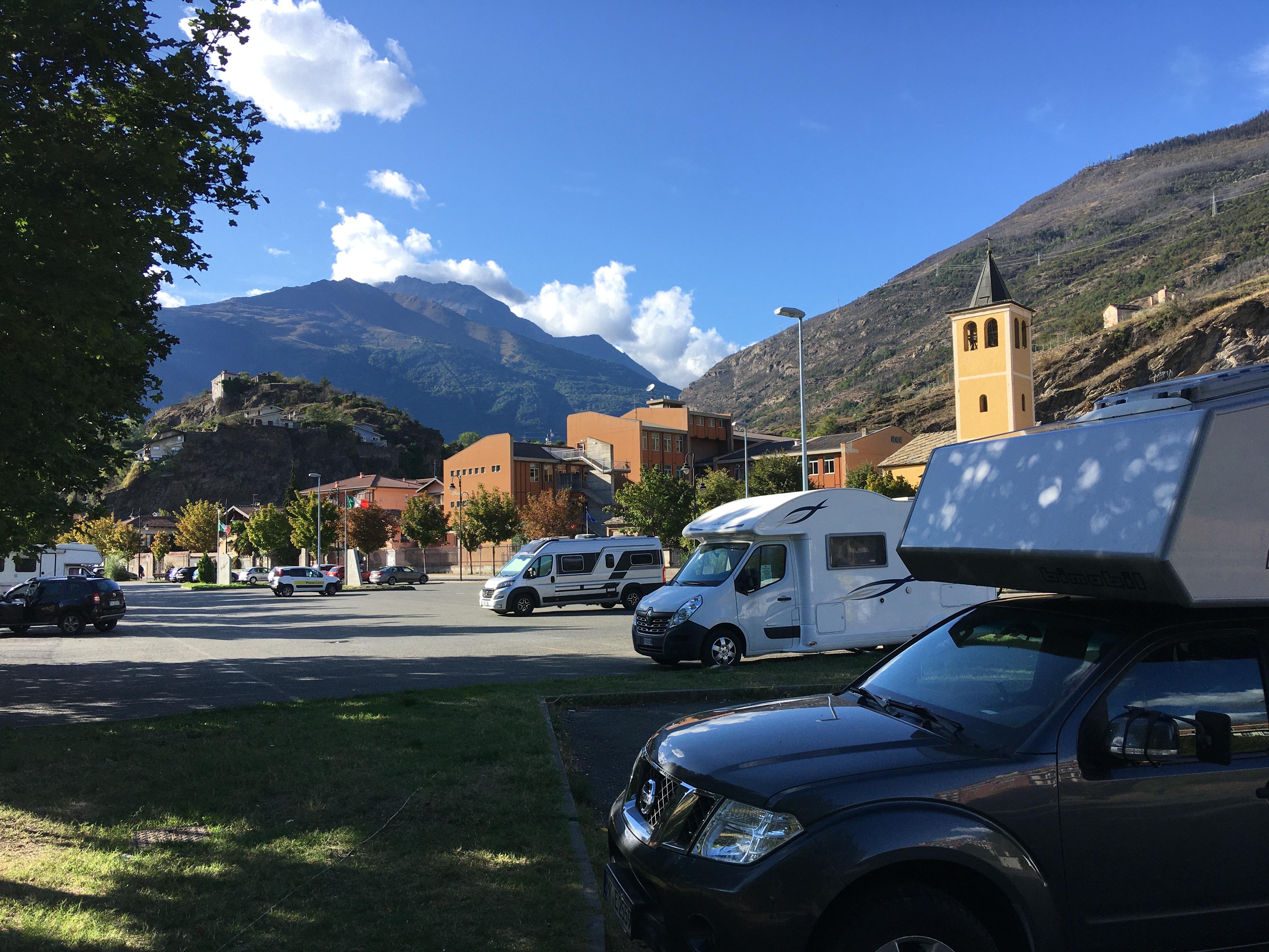 So 19.09. 86km Um 10:00 Uhr fahren wir bei leichtem Schneefall talwärts. Zu unserer großen Überraschung scheint im Tal die Sonne und wir besuchen Aosta bei schönstem Wetter. Dann fahren wir zum Übernachten auf einen Parkplatz in Fenis, machen einen Spaziergang zum Castello und essen im Ort.