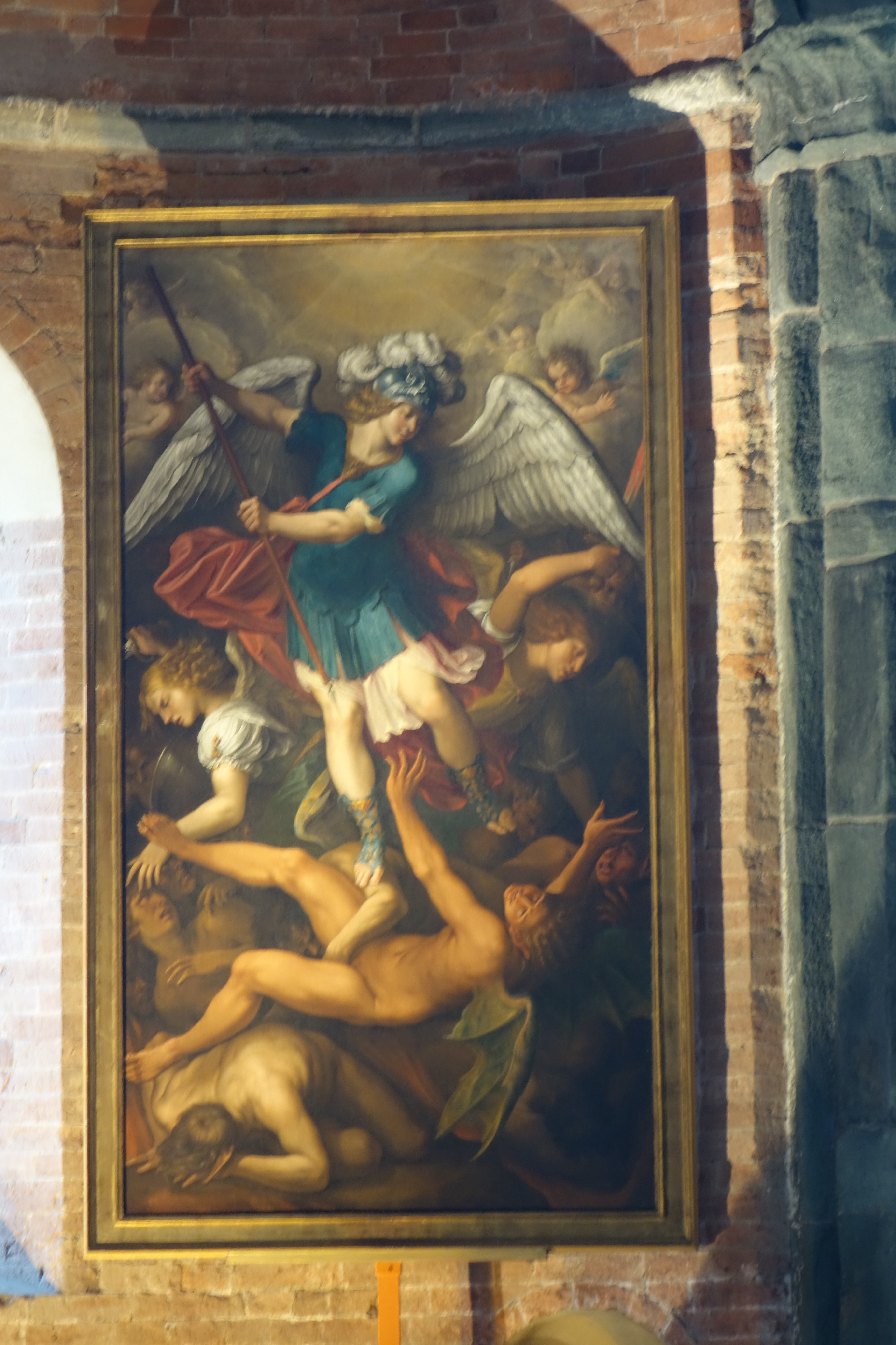 Mo 04.10. 105km Wir verlassen Saluzzo und fahren nach Mondovi-Piazza. Bei einem Stadtrundgang besichtigen wir den Dom, der innen extrem Prunkvoll ausgestattet ist. Von außen schmückt ihn eine schlichte Sandsteinfassade; der Rest ist simples Backstein-Mauerwerk. Die schöne mittelalterliche Stadt mit vielen barocken Elementen ist an vielen Stellen restaurationsbedürftig. Der Ausblick auf die typische piemontische Landschaft und die hohen Berge wird uns durch das diesige Wetter verwehrt. Über zum Teil sehr schlechte Straßen fahren wir weiter auf einen Stellplatz in Garessio. Dort gehen wir einkaufen und sind froh, dass wir beim Start des heftigen Gewitterregens wieder gemütlich im Bimo sitzen.