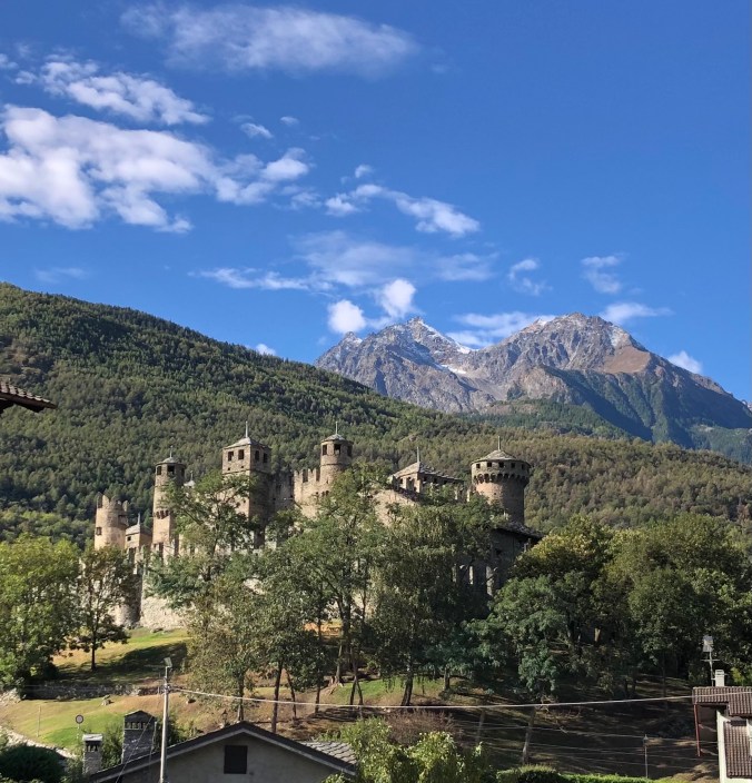 Wir fahren zum Castello de Issogne und nehmen gratis an einer italienischen Führung teil. Danach geht’s auf den Stellplatz in Hône. Von dort wandern wir durch die hübsche Kleinstadt Bard und besichtigen das Forte Bard. Abends besuchen wir eine Pizzeria.