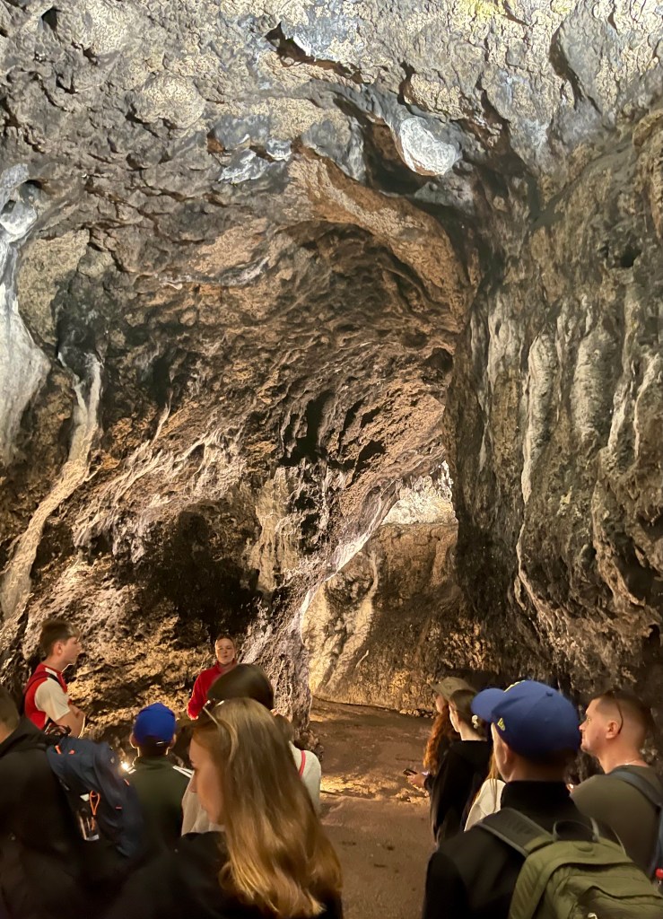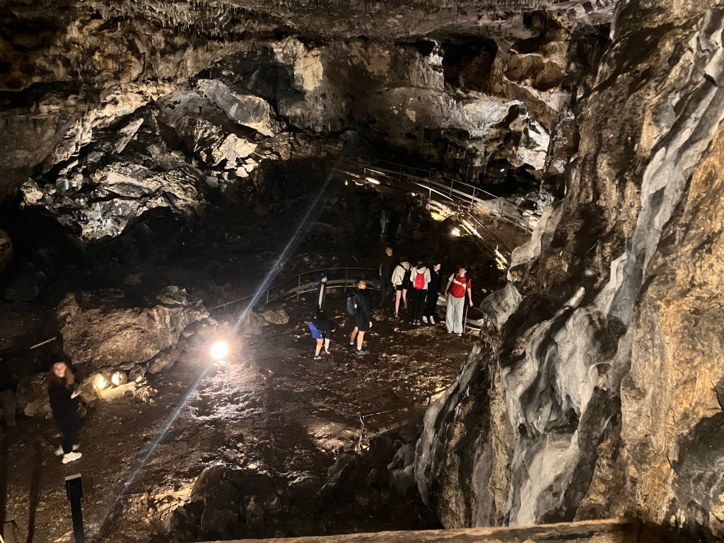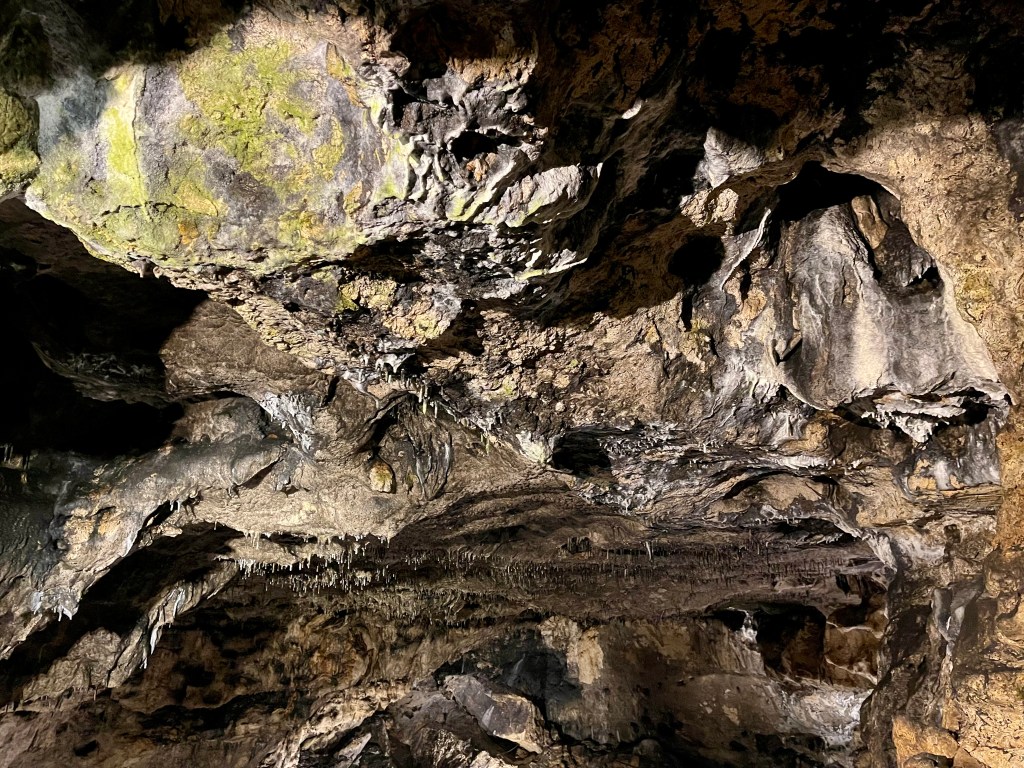 Frühmorgens ist schon Bewegung auf dem Parkplatz. Also laufen wir mit den vielen Besuchern zum Höhleneingang der Jaskinia Łokietka im Ojców-Nationalpark. Die geführte Tour geht ca. 320 m in den Berg, bei einer Temperatur von rund 7°.