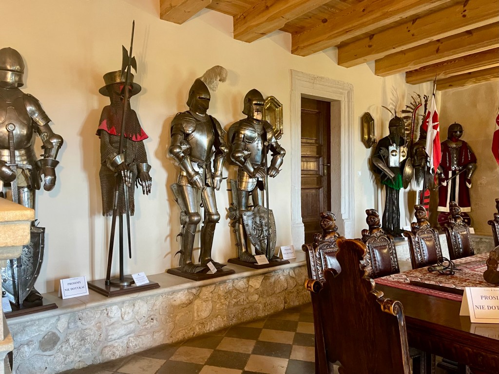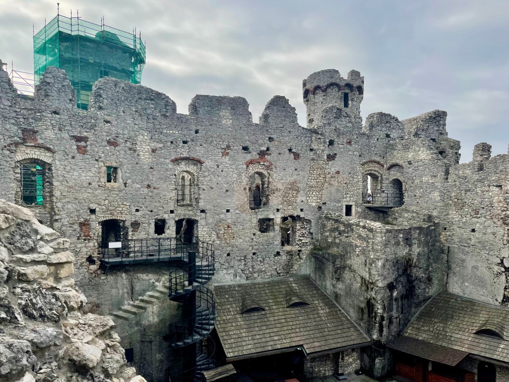 In der Burganlage angekommen, steigen wir die zahlreiche Treppen hinauf und wieder hinunter und erkunden die weitläufige Anlage. Die Burg stammt aus dem 14. Jahrhundert und gilt als die größte und bekannteste Ruine des Adlerhorst-Burgen-Wegs. Hoch auf den Kalkfelsen gelegen, beeindruckt sie mit ihren mächtigen Mauern, Türmen und verwinkelten Gängen. In einigen Gewölben treffen wir auf Darstellungen „höfischen Lebens“ des Mittelalters, die der Anlage eine besondere Atmosphäre verleihen. Dank der jüngsten Arbeiten erhielt die Burg eine neue Besichtigungsroute, die es den Besuchern ermöglicht, an Orte zu gelangen, die zuvor unzugänglich waren wie die einstige Schatzkammer und das Munitionslager. Der nachgebaute hölzerne Kreuzgang auf dem Ptasznik-Hof ist ebenfalls neu entstanden. Auch Filmszenen wurden hier gedreht, unter anderem für den Film Der Ritter von Lech Majewski aus dem Jahr 1980.