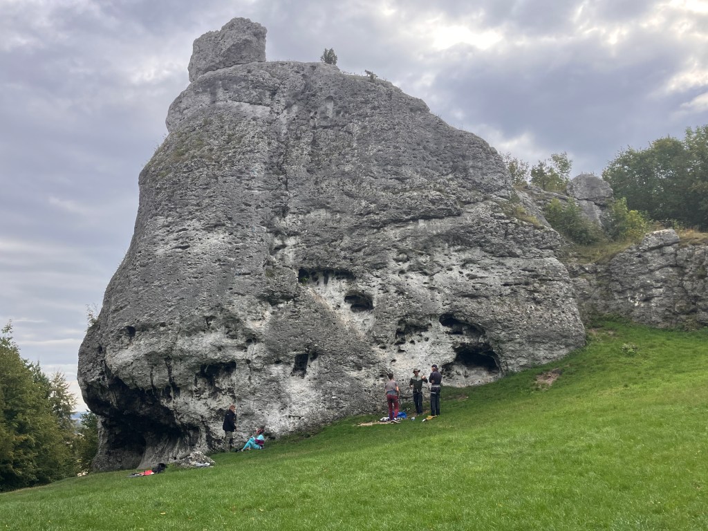 Vom Campingplatz laufen wir zur Burg Ogrodzieniec. Unterwegs beobachten wir einige Freeclimbern, die sich geschickt an den an den steilen Kalkfelsen nach oben arbeiten.