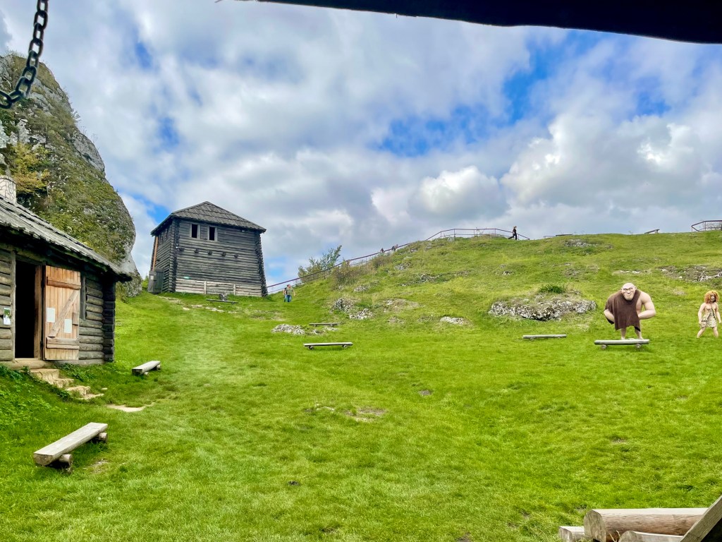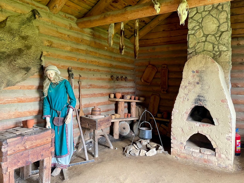 Begrüßt werden wir von ein paar recht seltsamen Gestalten – offenbar Darsteller in historischer Kleidung, was für einige heitere Momente sorgt. Auch hier sind die Holzhäuser mit Repliken frühmittelalterlicher Funde und entsprechenden Ausstattungen versehen.
