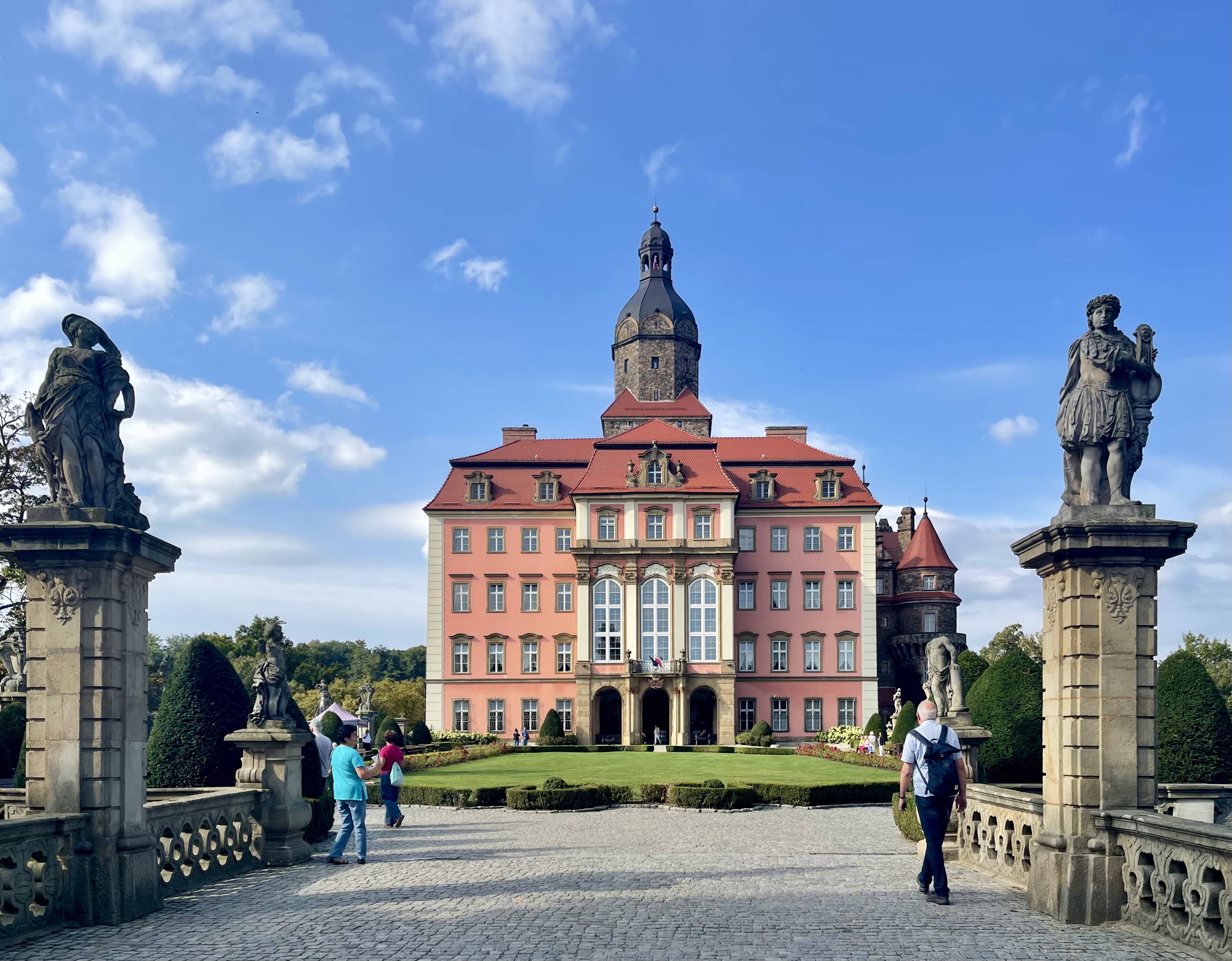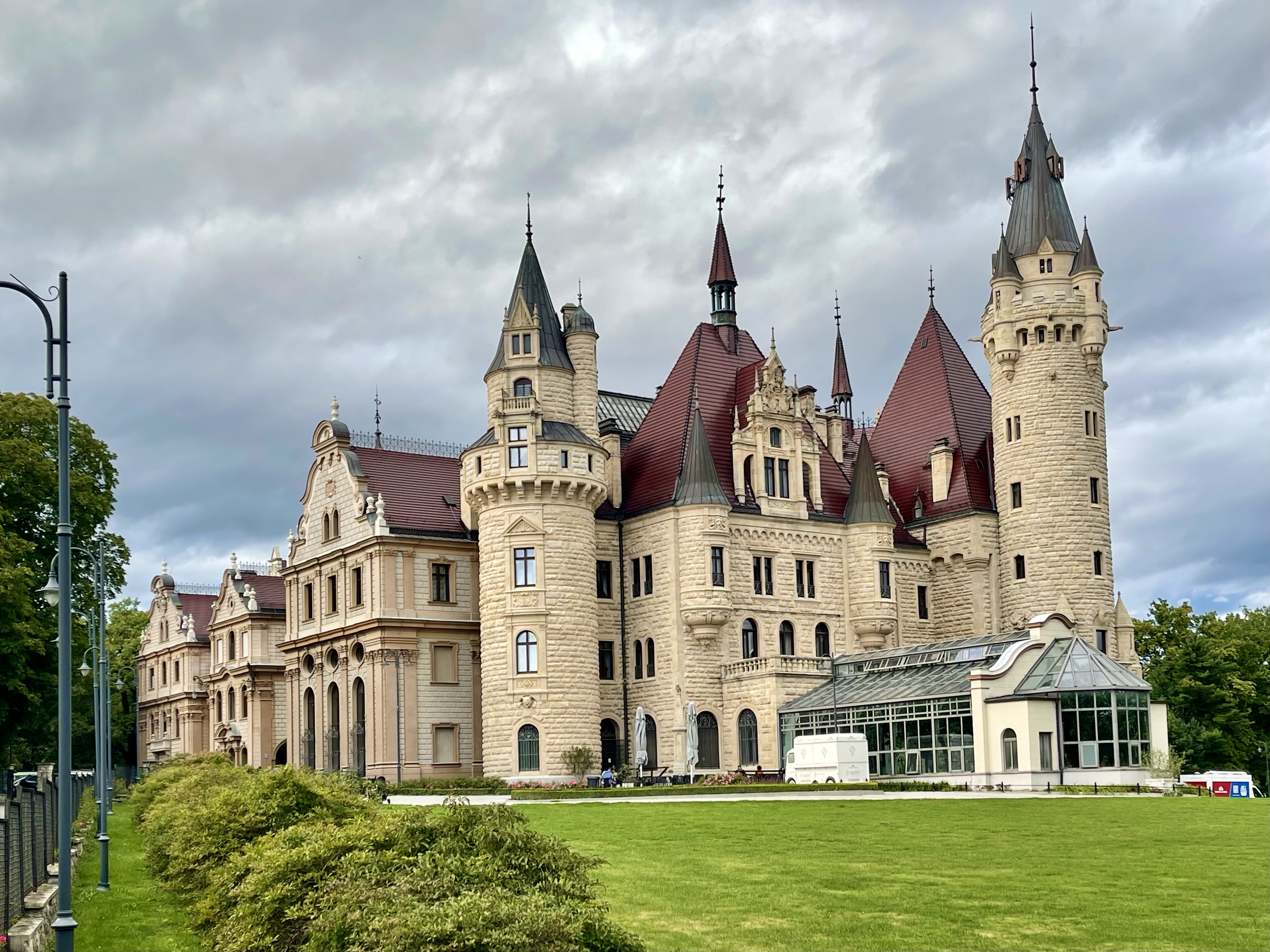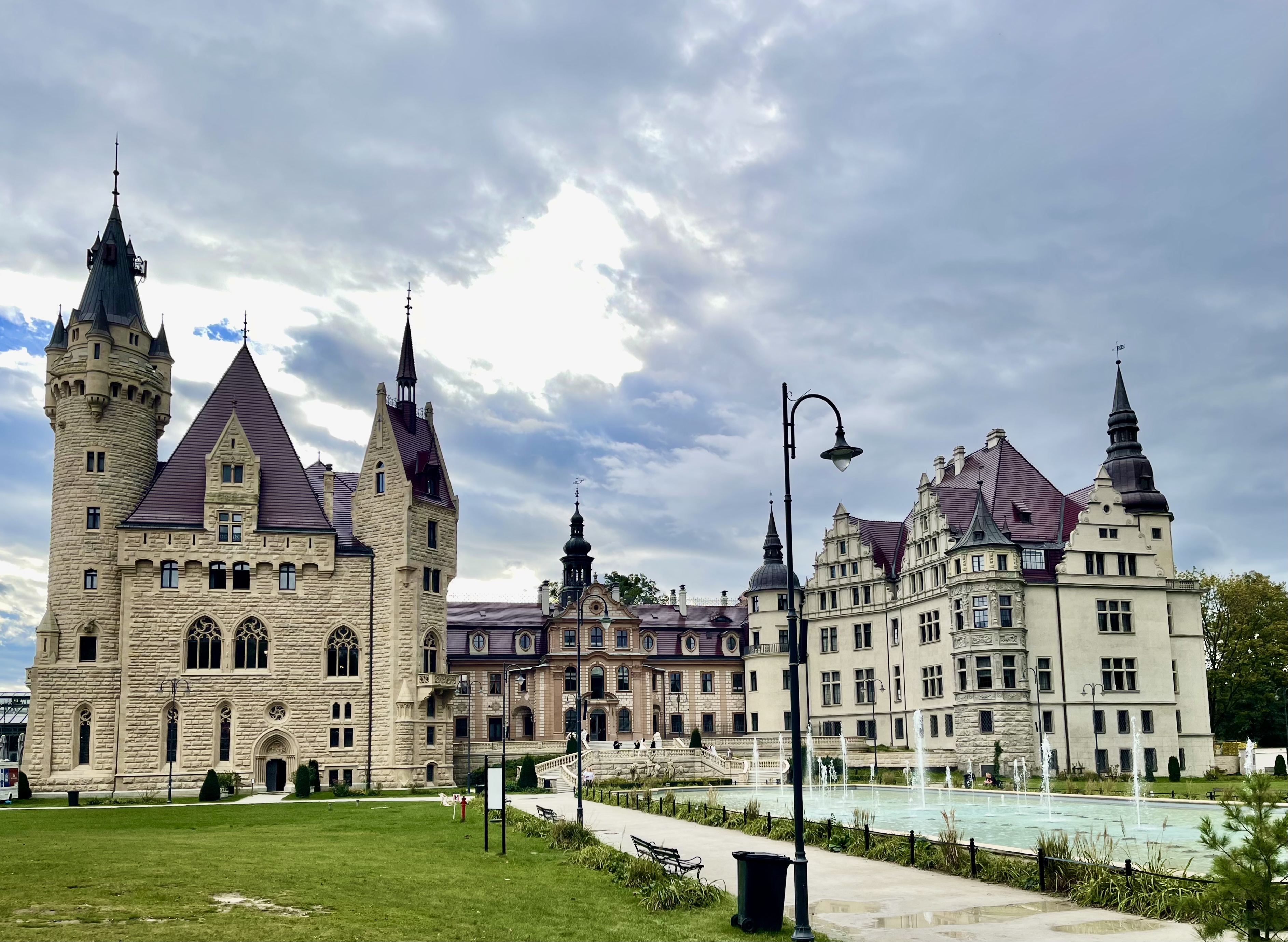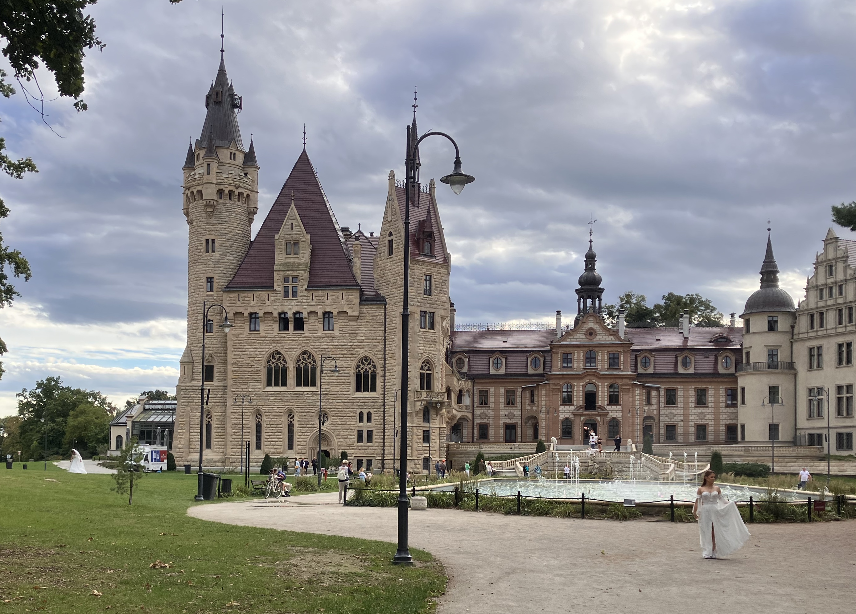 Anschließend fahren wir nach Moschen (Moszna) zu einem der märchenhaftesten Schlösser Polens. Es beeindruckend mit seinen 99 Türmen und Türmchen und wurde im 19. und frühen 20. Jahrhundert als Sitz der Familie von Tiele-Winckler erbaut. Wir schlendern durch den weitläufigen Schlosspark, in dem alte Eichen Schatten spenden und beobachten gleich fünf Brautpaare bei ihren Fotosessions, jeweils begleitet von zwei Fotografen. Am Abend kehren wir noch einmal zum Schloss zurück, um die musikalisch untermalten, farbigen Wasserspiele zu bestaunen – ein stimmungsvoller Abschluss unseres Tages. Wir übernachten auf einem Stellplatz in der Nähe des Schlosses.