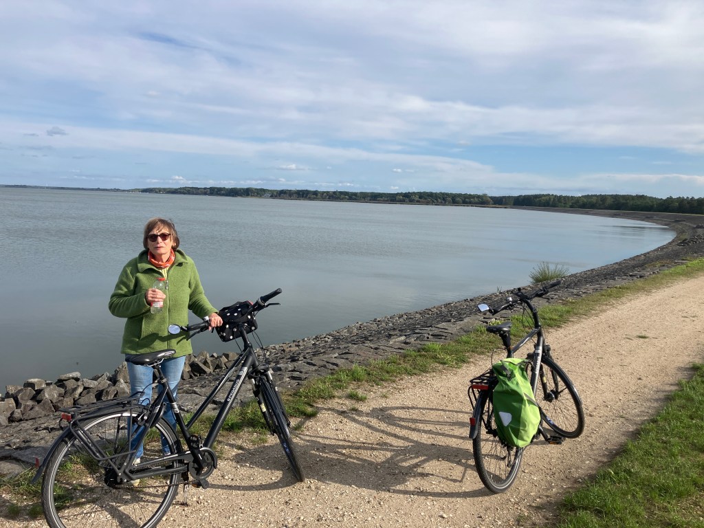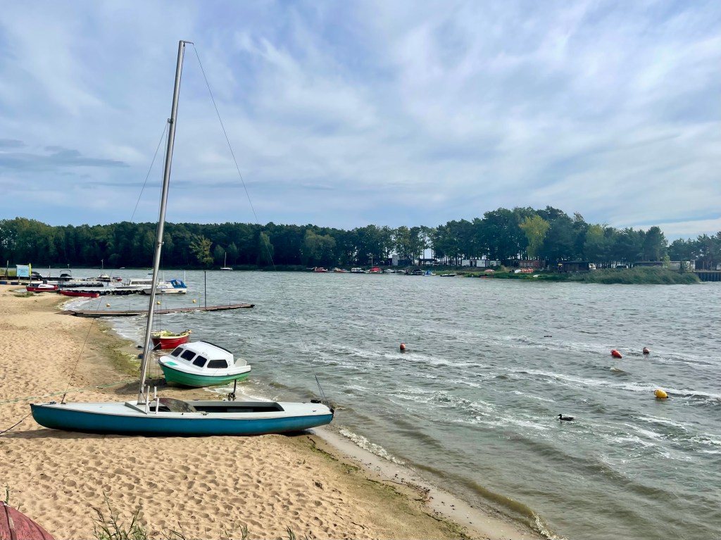 Auf unserem Weg durch riesige Waldgebiete finden wir glücklicherweise eine kleine Tankstelle in einem kleinen Dorf. Wir fahren zum Turawa-Stausee, dessen Bauzeit von 1933 bis 1939 dauerte. Mit einer aufgestauten Fläche von rund 20 km² zählt er zu den größten künstlichen Seen Schlesiens. Er stabilisiert den Wasserstand der Oder und spielt somit eine zentrale Rolle für Landwirtschaft, Schifffahrt und Industrie. Außerdem befinden sich am See kleinere Wasserkraftwerke zur Energiegewinnung. Am rudimentären Camping (Wir stehen eigendlich mitten im Wald.) schwingen wir uns auf die Fahrräder und umrunden den See auf einer 25,7 km langen Strecke. Unterwegs legen wir eine Pause ein und genießen einen Cappuccino und ein köstliches Stück Pflaumenstreusel in einem Gartenrestaurant direkt am See.