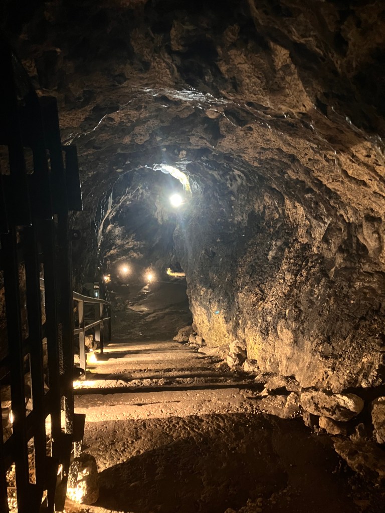 Die Tickets für die Untergrundtour um 11.00 Uhr haben wir bereits am Vortag online gekauft. Die Führung durch das unterirdische System ist beeindruckend: Gewaltige Stollen auf zwei Ebenen, etwa 15 und 50 Meter unter der Erde. Die Gänge sind so groß angelegt, dass problemlos eine Lokomotive mit mehreren Anhängern hindurchfahren könnte.