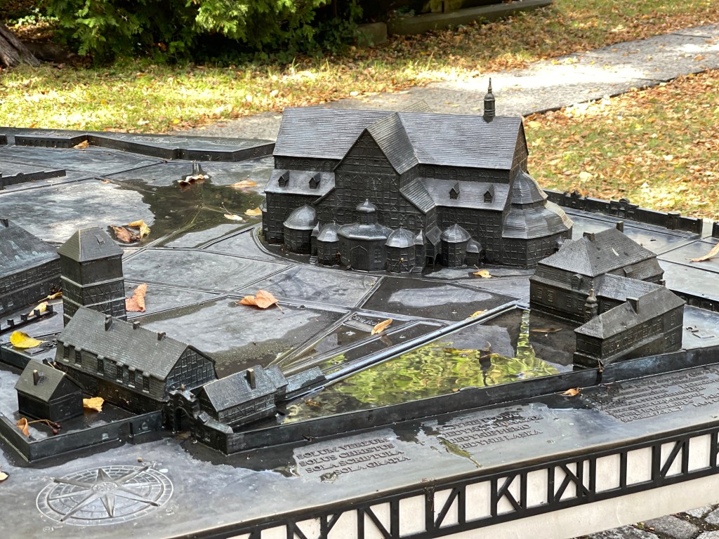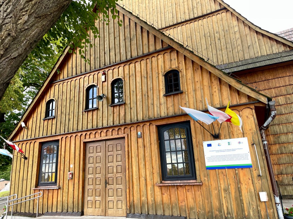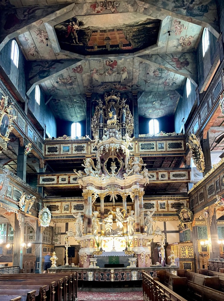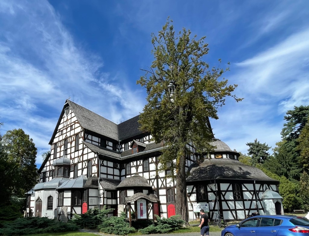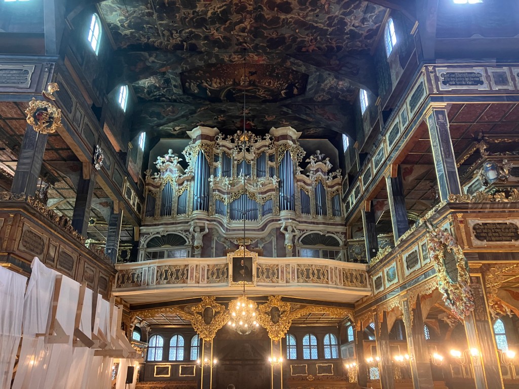 Weiter geht es nach Schweidnitz auf den Campingplatz. Von dort fahren wir mit den Fahrrädern in die Altstadt. Wir werfen nur einen kurzen Blick in die Kathedrale, denn dort beginnt gerade die Mittagsmesse und wir wollen nicht stören. Also geht es weiter zur Evangelischen Friedenskirche. Sie hat eine außergewöhnliche Geschichte: Der Grundstein wurde im August 1653 gelegt, und bereits im Juli 1657 fand hier der erste Gottesdienst statt. Auf einer Grundfläche von rund 1090 m² bietet sie Platz für etwa 7500 Menschen, davon rund 3000 Sitzplätze. Der Glockenturm wurde erst 1708 in unmittelbarer Nähe der Kirche errichtet. Der Bau unterlag strengen Auflagen von Kaiser Ferdinand III.: Die Kirche musste innerhalb eines Jahres errichtet werden, und als Baumaterial waren ausschließlich Holz, Sand, Lehm und Stroh erlaubt. Umso beeindruckender ist die üppige barocke Innenausstattung. Heute gehört die Friedenskirche zum UNESCO-Weltkulturerbe.
