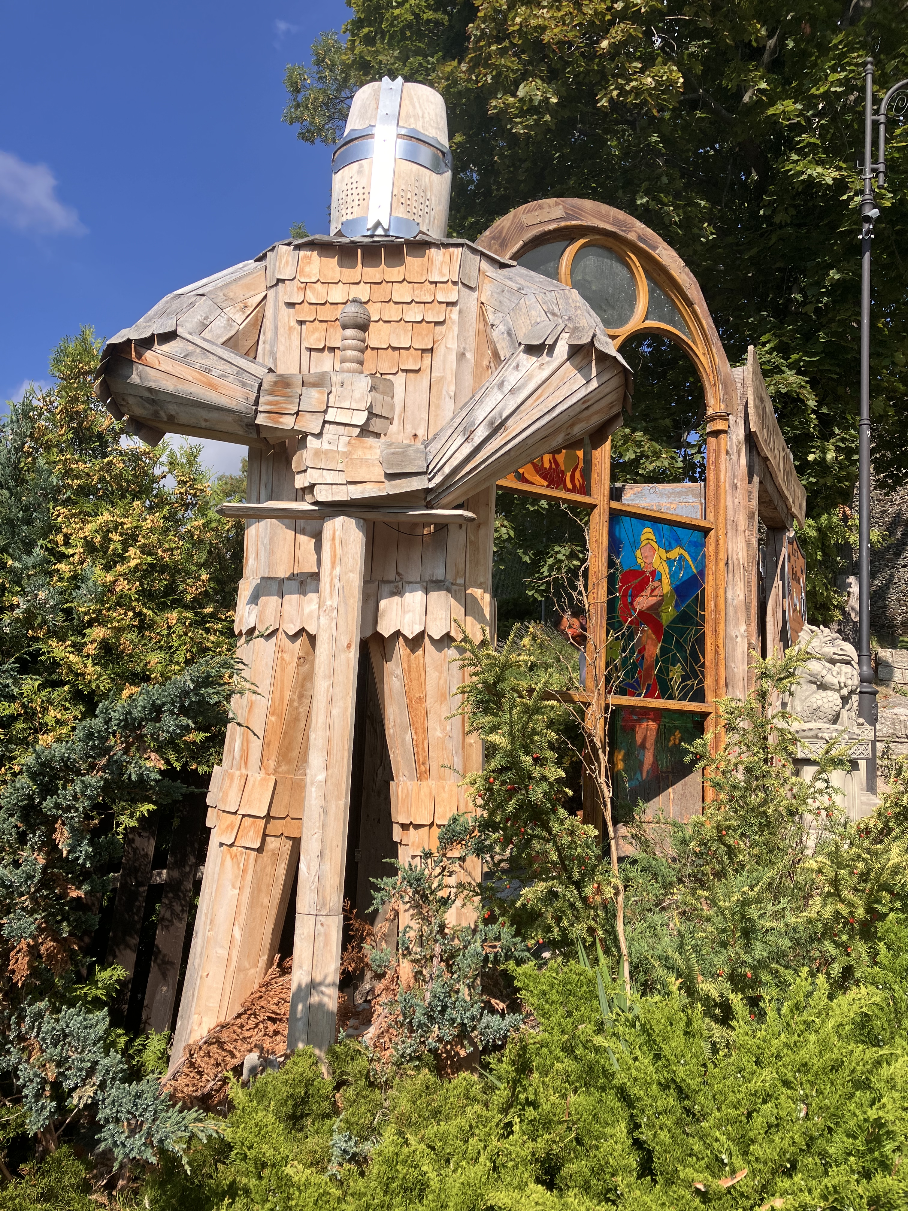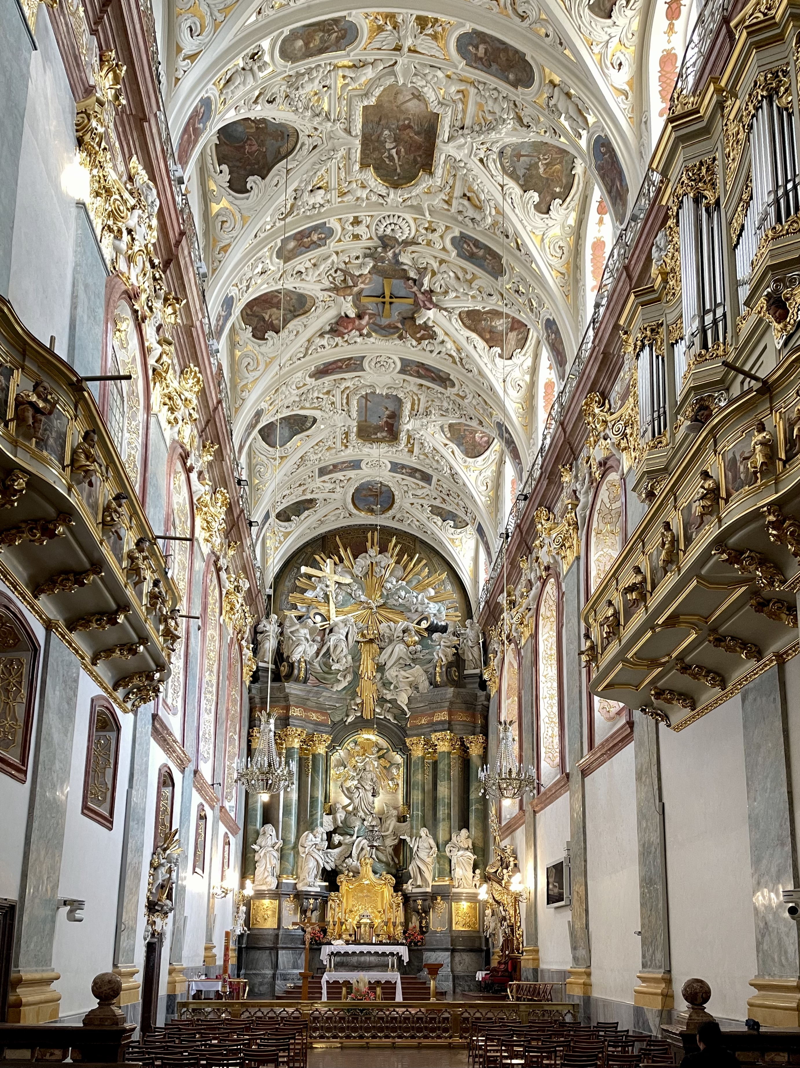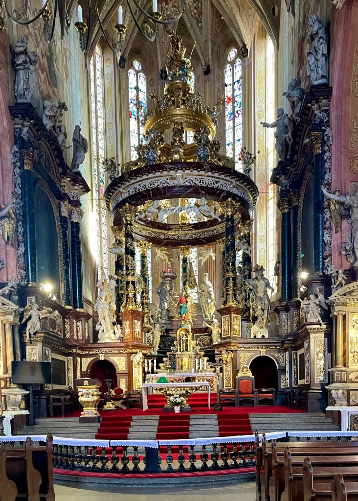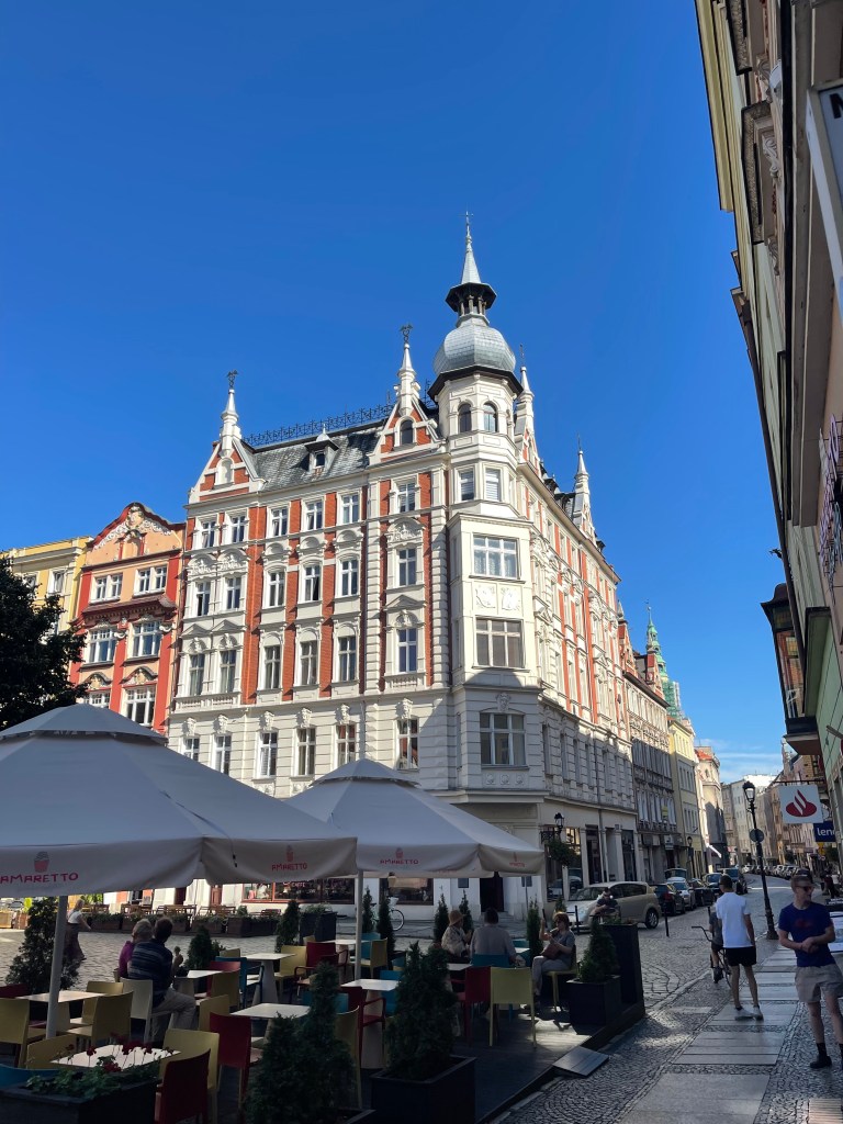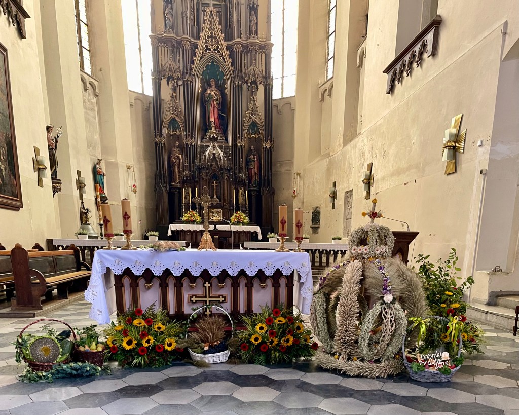 Weiter geht es nach Schweidnitz auf den Campingplatz. Von dort fahren wir mit den Fahrrädern in die Altstadt. Wir werfen nur einen kurzen Blick in die Kathedrale, denn dort beginnt gerade die Mittagsmesse und wir wollen nicht stören. Also geht es weiter zur Evangelischen Friedenskirche. Sie hat eine außergewöhnliche Geschichte: Der Grundstein wurde im August 1653 gelegt, und bereits im Juli 1657 fand hier der erste Gottesdienst statt. Auf einer Grundfläche von rund 1090 m² bietet sie Platz für etwa 7500 Menschen, davon rund 3000 Sitzplätze. Der Glockenturm wurde erst 1708 in unmittelbarer Nähe der Kirche errichtet. Der Bau unterlag strengen Auflagen von Kaiser Ferdinand III.: Die Kirche musste innerhalb eines Jahres errichtet werden, und als Baumaterial waren ausschließlich Holz, Sand, Lehm und Stroh erlaubt. Umso beeindruckender ist die üppige barocke Innenausstattung. Heute gehört die Friedenskirche zum UNESCO-Weltkulturerbe.